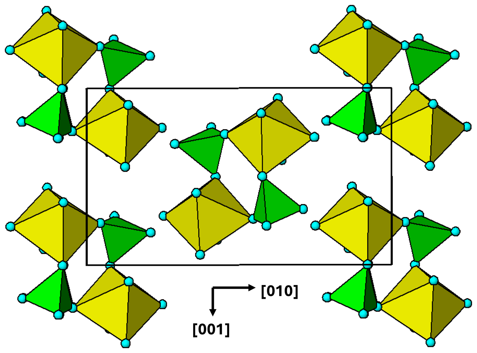 Although the isolated cyclic tetramer is not known in phosphate minerals, the structure of phosphosiderite, Fe3+(PO4) ⋅ 2H2O, is built from cyclic tetramers sharing corners with eight adjacent clusters (Moore, 1966), as shown in Fig. 3. The octahedra in each cluster share a corner with the tetrahedra of four surrounding clusters, and vice versa, resulting in the elimination of 4 H2O per cluster.