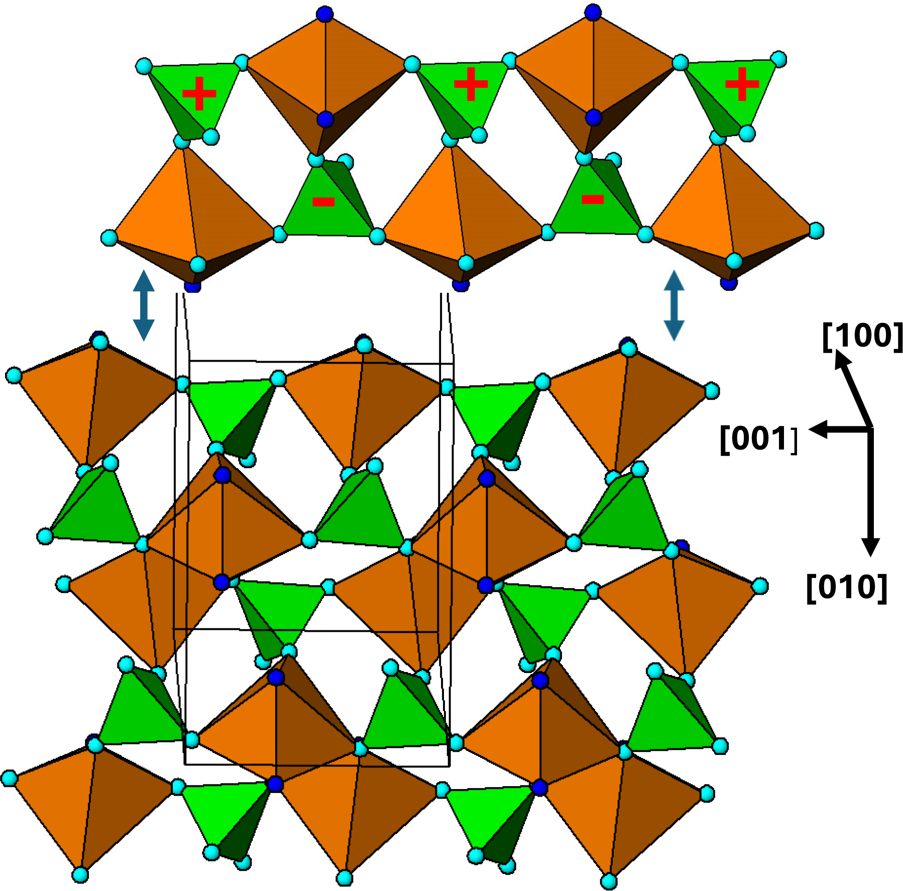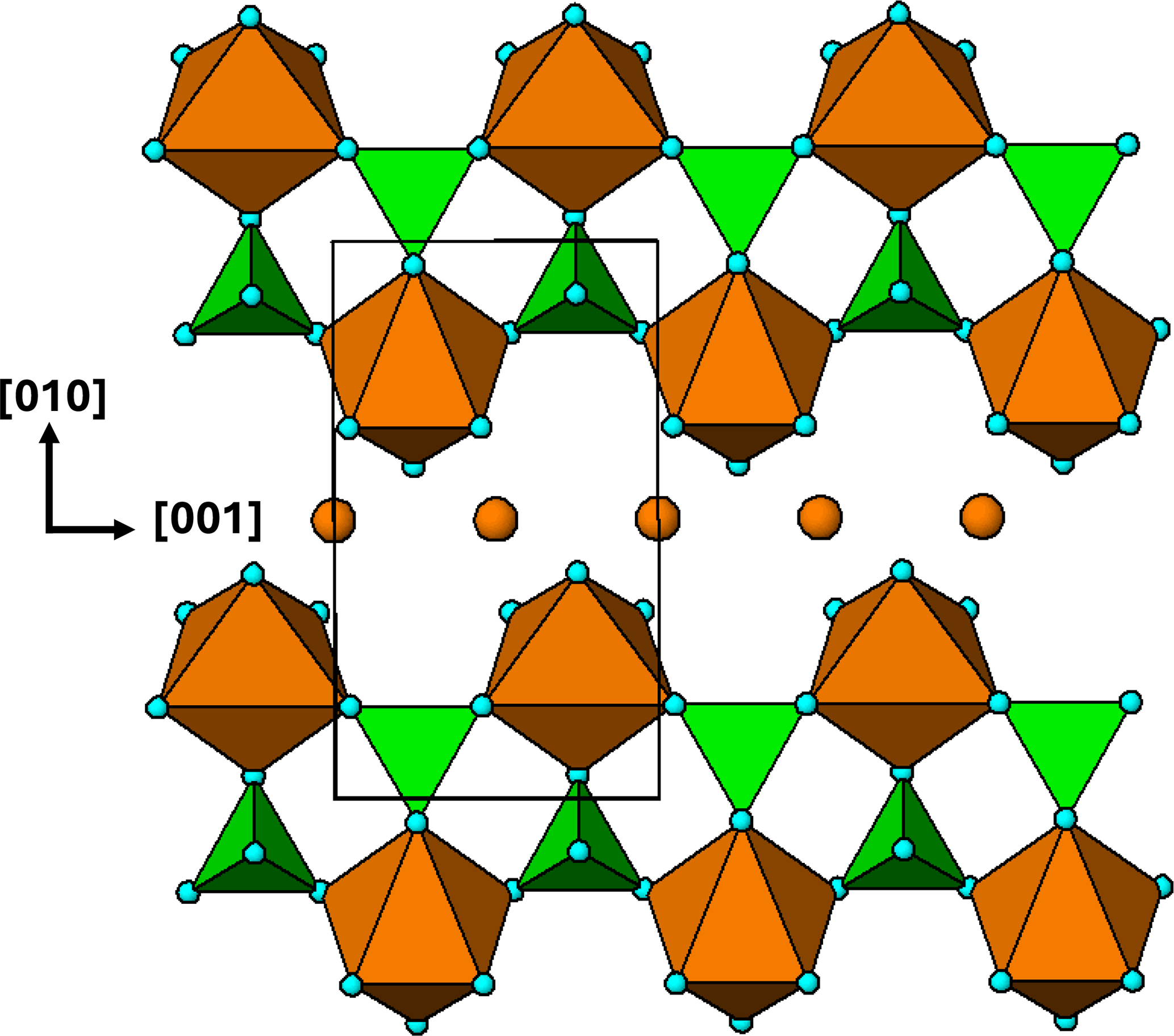 Figure 5(100) layer of the triphylite–heterosite-sarcopside structure. The brown circles correspond to octahedral sites occupied by Li in triphylite, vacancies in heterosite and alternating Fe2+ and vacancies in sarcopside.