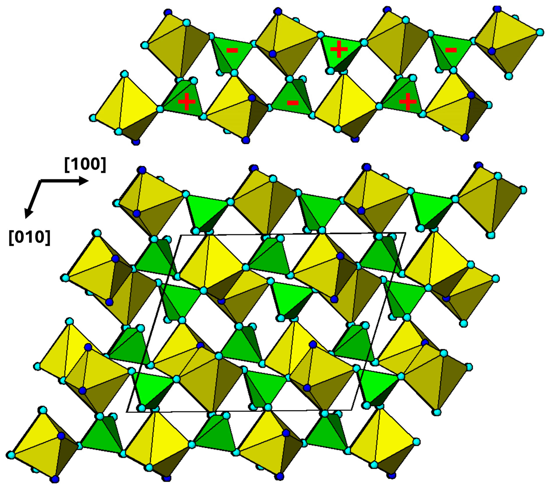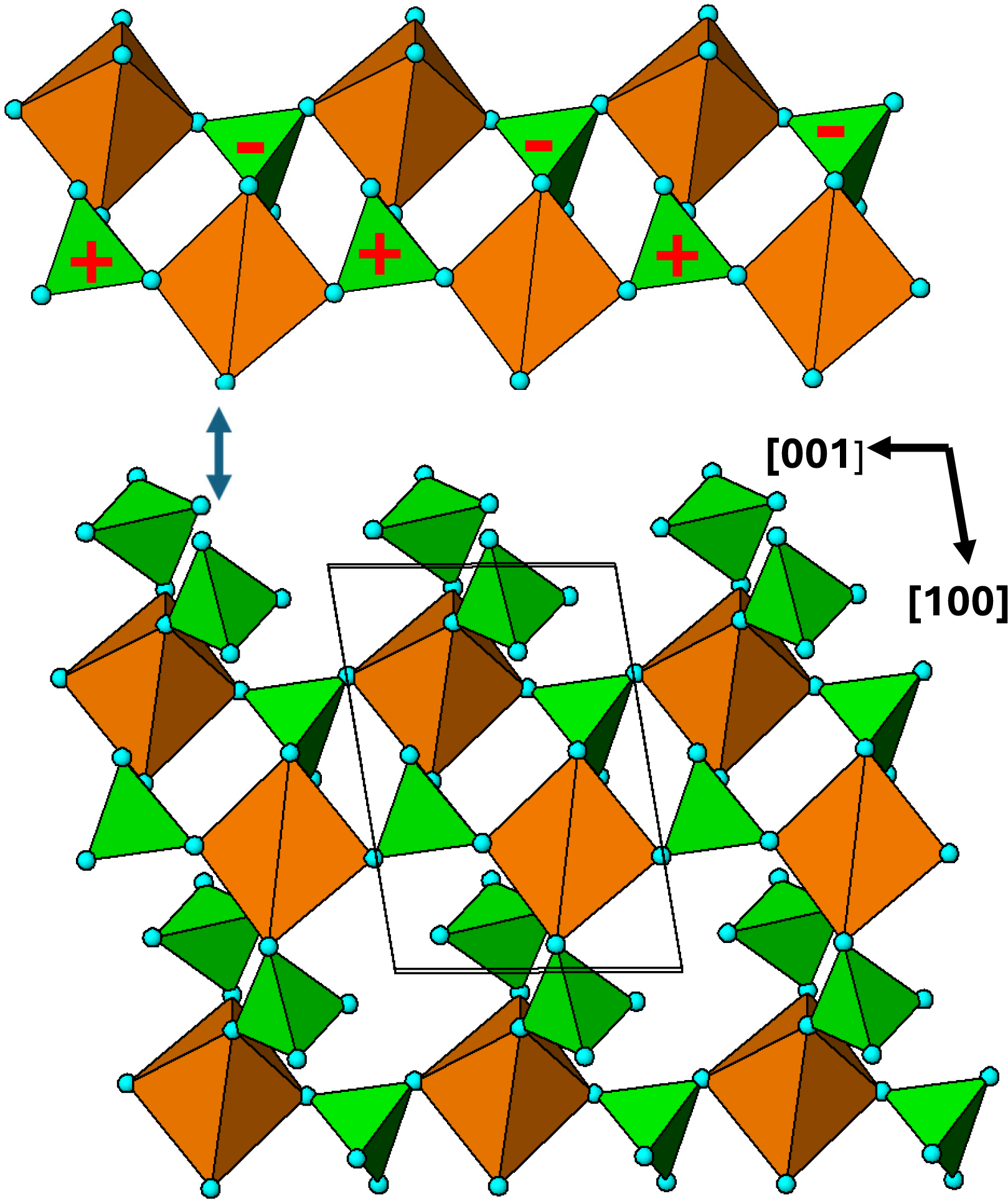 Figure 12[010] view of the M2 substructure in graftonite. A 2-octahedra-wide PCT ribbon along [001] is separated above the structure. Orientations of tetrahedra shown by the symbols + and −.