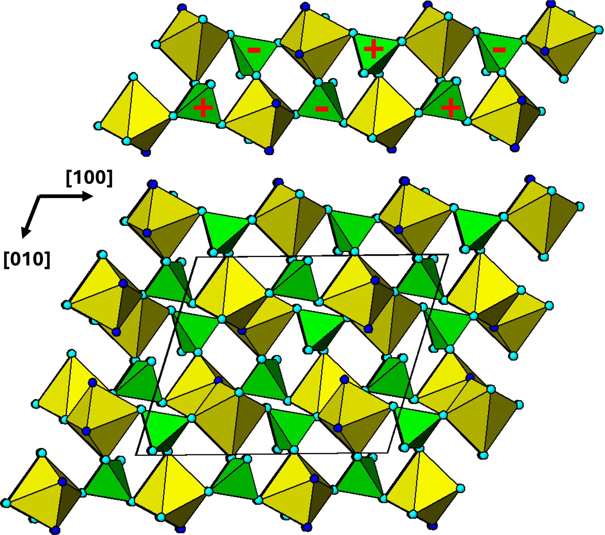 Figure 10[001] projection of the M1 substructure in zwieselite. A 2-octahedra-wide PCT ribbon along[100] is separated in the upper part of the diagram. Orientations of tetrahedra shown by the symbols + and −. The dark-blue circles correspond to F.