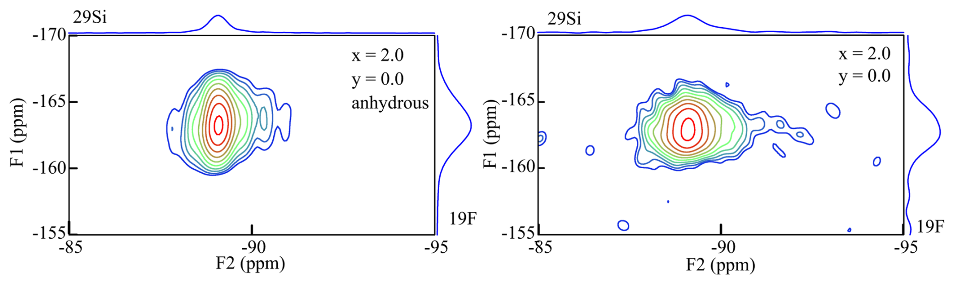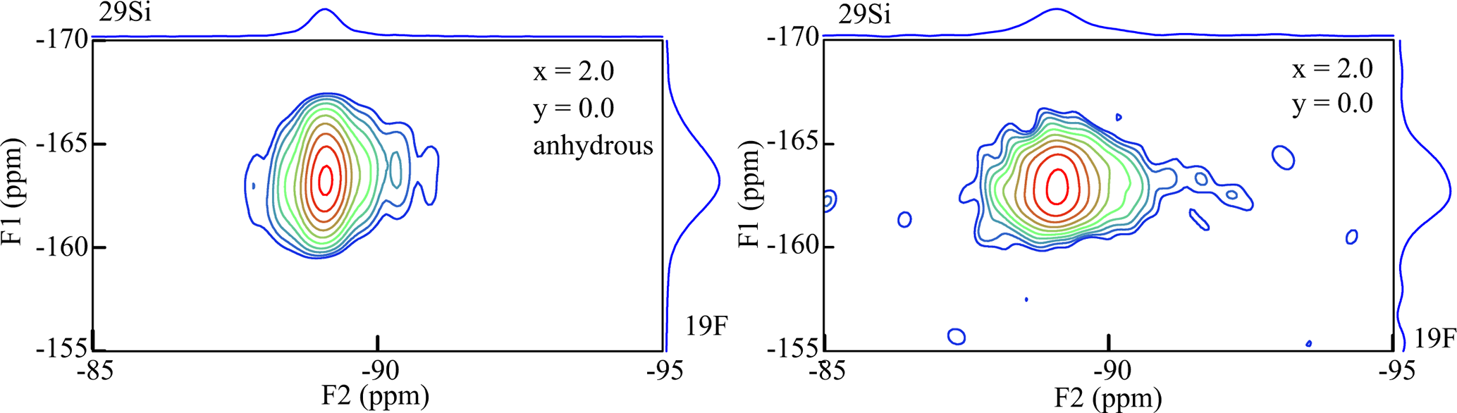 Figure 3{19F}29Si HETCOR spectra of the anhydrous (left) and the “normal” (right) polylithionite (x=2.0, y=0.0) samples. The F1 axis refers to the 19F NMR signals and the F2 axis to the 29Si NMR signals.