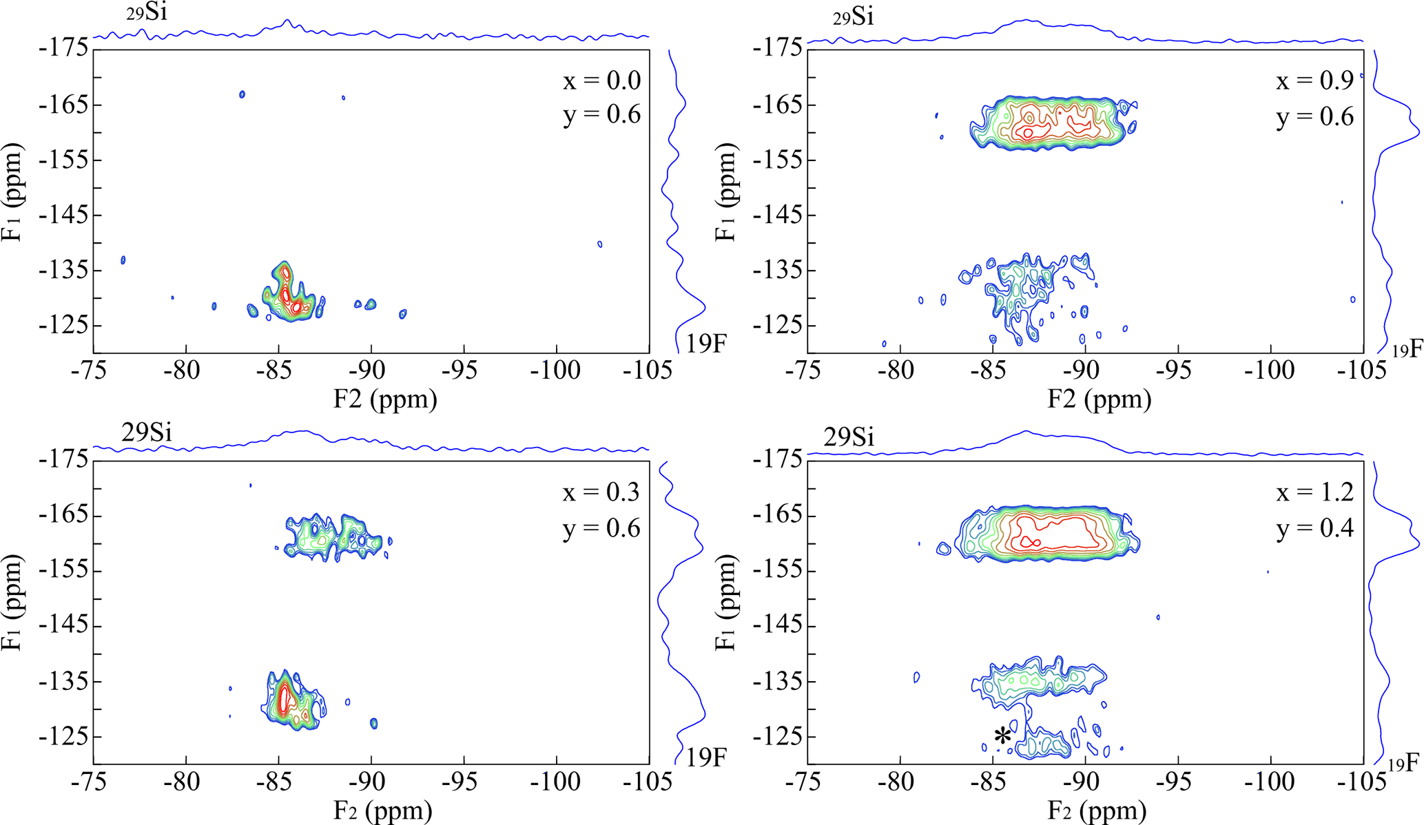 It can also be observed that the 1H signal in the HETCOR spectrum is not the same as the 1H signal in the typical MAS NMR spectrum (Sulcek et al., 2023) in terms of intensity, but it does correlate with the strength of the Si environment. It seems that there are clusters in the structure that differ due to the chemical composition.