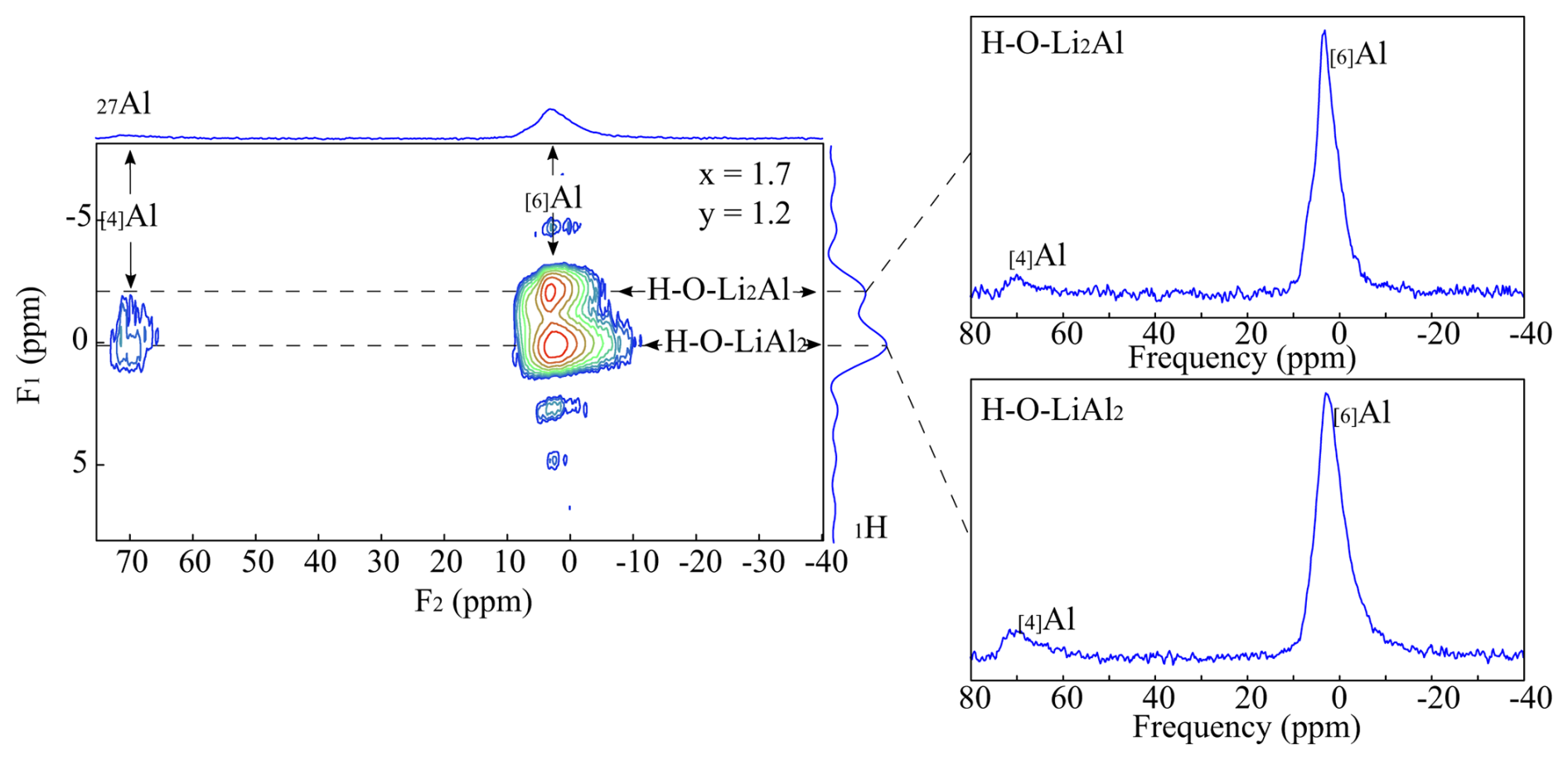 The signal belonging to the Li2Al-F (−163 ppm) environment is split into two different ones. One at −163 ppm appears with a strong cross-correlation to [6]Al and a weak one to [4]Al. The other one, at −160 ppm, shows a similar behaviour, but the correlation to [4]Al is stronger. Since F especially prefers Li-rich environments, the Li2Al position has a higher intensity. A small amount of F is also incorporated on the LiAl2 site. This environment shows correlations with both [6]Al and [4]Al but with a stronger correlation to [6]Al.