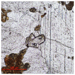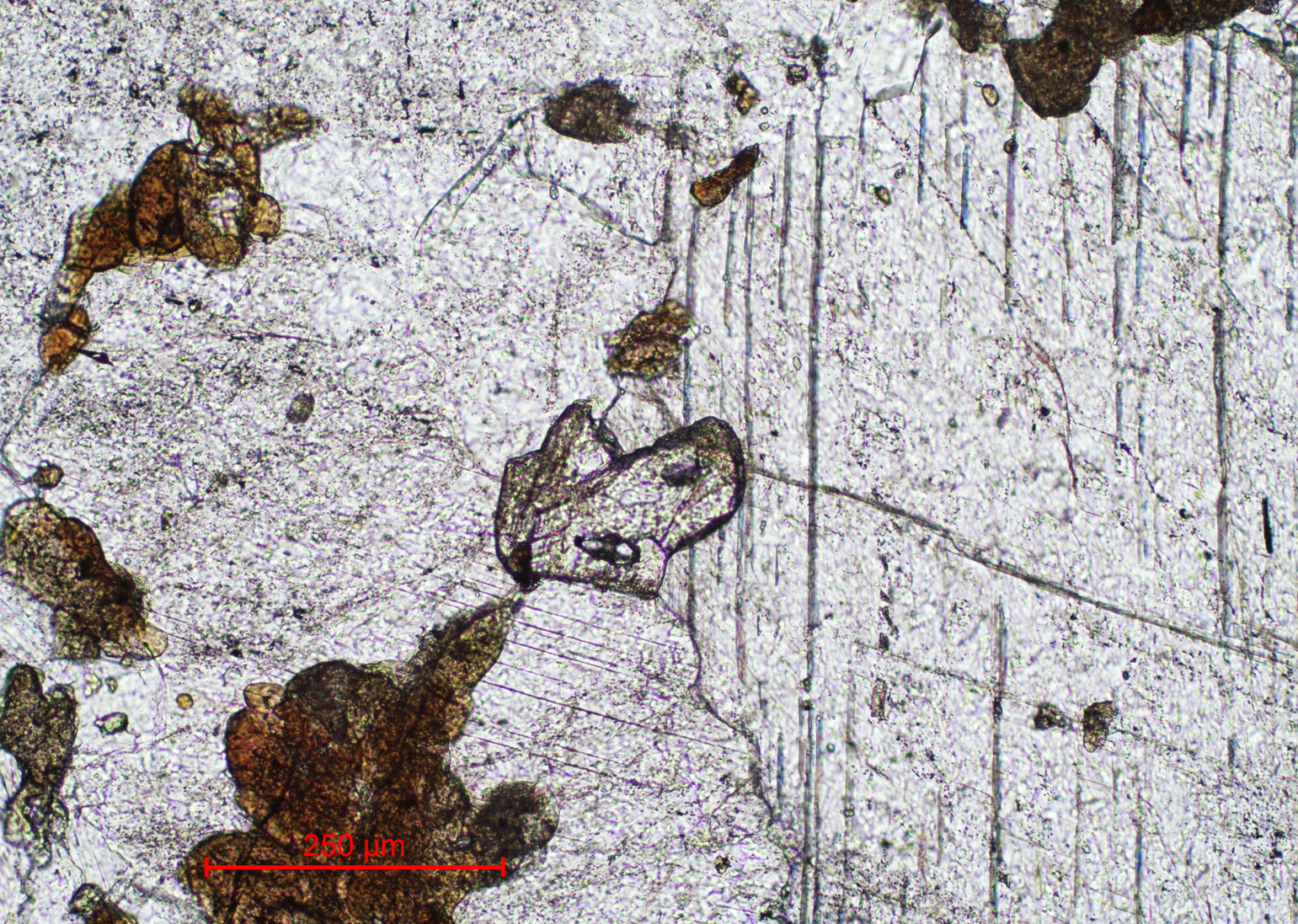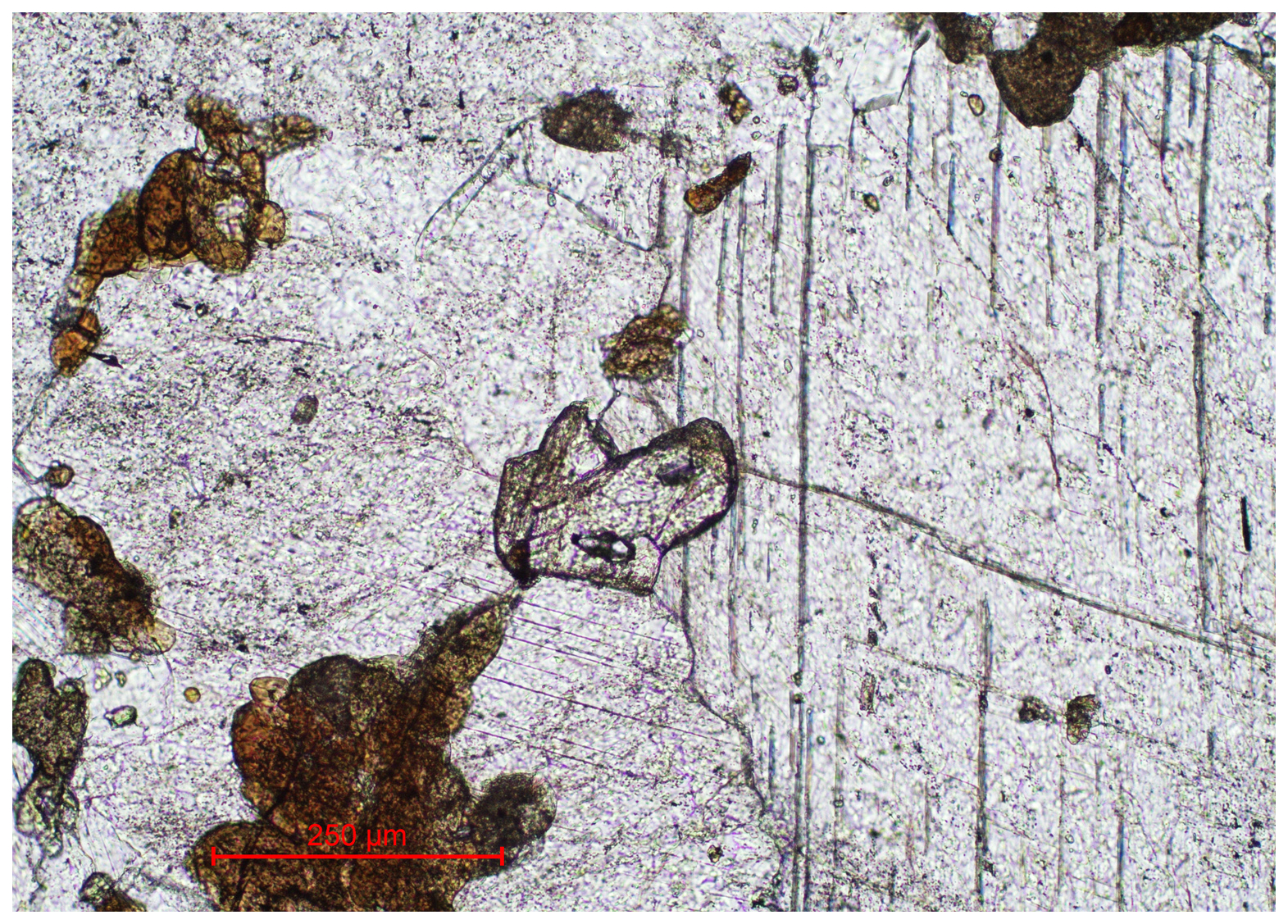 Figure 2Transmitted-light microscopy image in plane-polarised light of near-colourless åsgruvanite-(Ce) with high optical relief (centre) in calcite matrix. Pleochroic aggregates in brownish hues are composed of the dollaseite-like allanite group mineral.