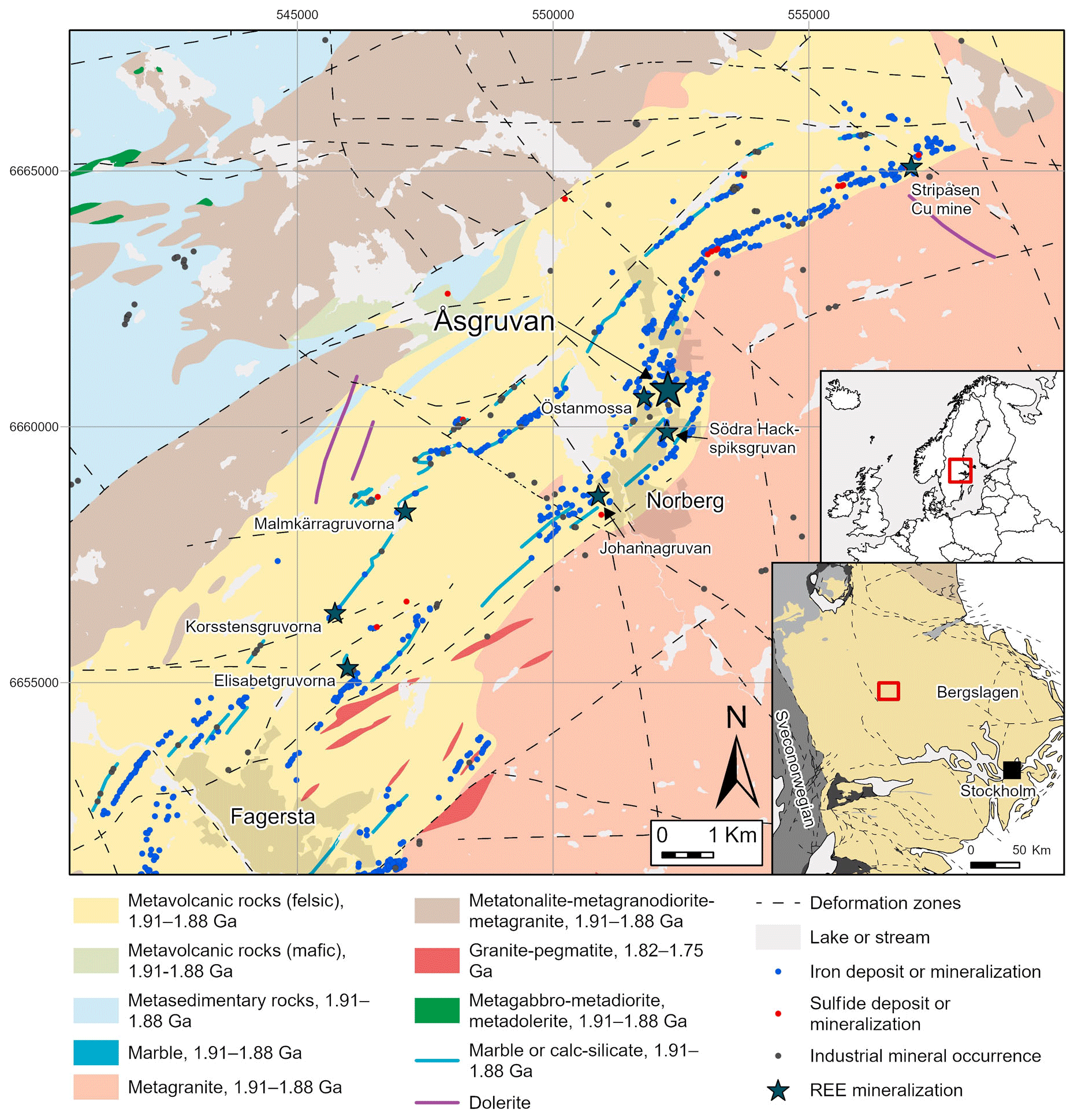 The majority of mineralisations in the ore province are primarily hosted by a ca. 1.91–1.88 Ga Svecofennian metasupracrustal succession, most importantly comprising felsic (rhyolitic to dacitic) metavolcanic rocks with intercalated, often skarn-altered marbles, interpreted to have originally formed in a continental back-arc setting (Allen et al., 1996). Essentially, syn-volcanic to younger intrusive rocks of mainly a granitoid character, with minor mafic units, intruded into this metasupracrustal package and constitute large volumes of the presently exposed bedrock in Bergslagen, including the Norberg area (Fig. 1). The REE-enriched Fe-skarn deposits of Bastnäs type occur along an over 100 km long belt of variably marble-bearing, felsic metavolcanic rocks known as the “REE line”, stretching from Nora in the southwest via Bastnäs to (and beyond) the Norberg area in the northeast (e.g. Andersson et al., 2024, and references therein). Polyphase regional metamorphism of greenschist to upper amphibolite facies grade during the ca. 1.90–1.80 Ga Svecokarelian orogeny, together with associated ductile to brittle deformation, has variably affected all of the older rocks in the province, as well as their mineralisations.