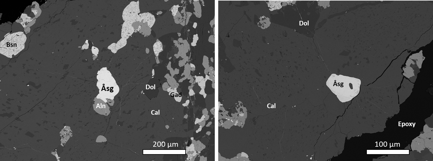 As inferred for the Bastnäs-type deposits of Bergslagen in general (Holtstam et al., 2014; Sahlström et al., 2019), the predominant REE minerals at Åsgruvan are metasomatic skarn products, likely formed from hot (>400 °C) magmatic fluids rich in REE ± other metals, Si, Cl, F, etc. that have infiltrated and reacted with carbonate layers. Yet, as is also the case with the arrheniusite-(Ce)-bearing assemblage from the nearby Östanmossa mine (Holtstam et al., 2021b), the åsgruvanite-(Ce) is hosted by a younger generation of calcite, hosted by fractures that cross-cut the main skarn and carbonate assemblages. Thus, these and associated minerals formed at a later stage than the main REE and Fe mineralisation and the associated skarn during brittle tectonic conditions, most likely through fluid-mediated remobilisation of key elements. Such late-stage mineralisation is a relatively common yet previously often overlooked feature in Bastnäs-type deposits (see Andersson et al., 2024).
