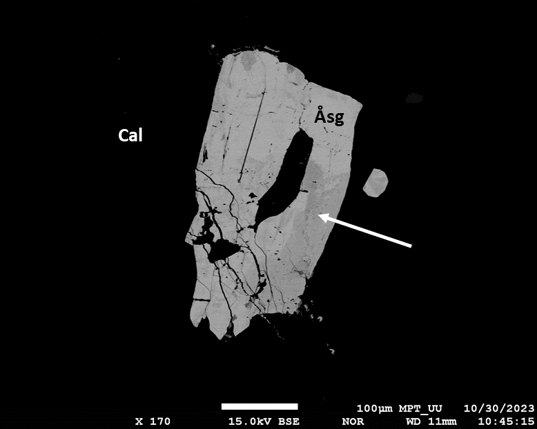 Figure 4SEM-BSE image of a large (ca. 400 µm) åsgruvanite-(Ce) crystal (Åsg), with altered portions (white arrow) and fractures. Black areas on the image are calcite (Cal).