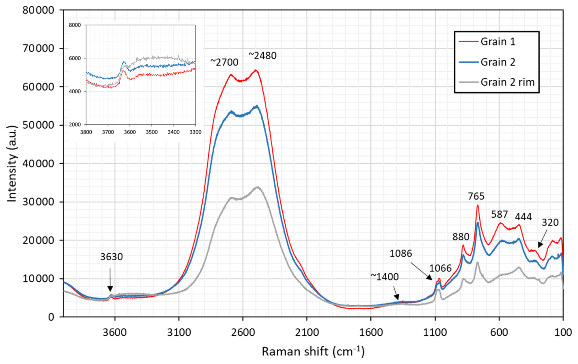 The obtained spectra (Fig. 6) are heavily influenced by fluorescence between 2000 and 3000 cm−1. The most prominent peaks of other regions are interpreted as follows: 1086, 1066 cm−1 symmetric stretching of C–O bonds; 880 cm−1 Si–O stretching; 765 cm−1 As3+–O stretching; 587 cm−1 Si–O bending; and 444, 320 cm−1 metal–O vibrations. Specifically, the band at 765 cm−1 is diagnostic with respect to arsenite groups (Bahfenne et al., 2012; Holtstam et al., 2021a), in contrast to arsenate, for which the As5+–O symmetric stretch is manifested with bands >800 cm−1 (Frost and Kloprogge, 2003). The very weak (broad) feature at ca. 1400 cm−1 relates to asymmetric stretching of CO3 groups. The weak band at 3630 cm−1 originates from O–H stretching modes, and this value would correspond to a long OH…O bridge, ≥3 Å, according to the empirical correlations found by Libowitzky (1999).