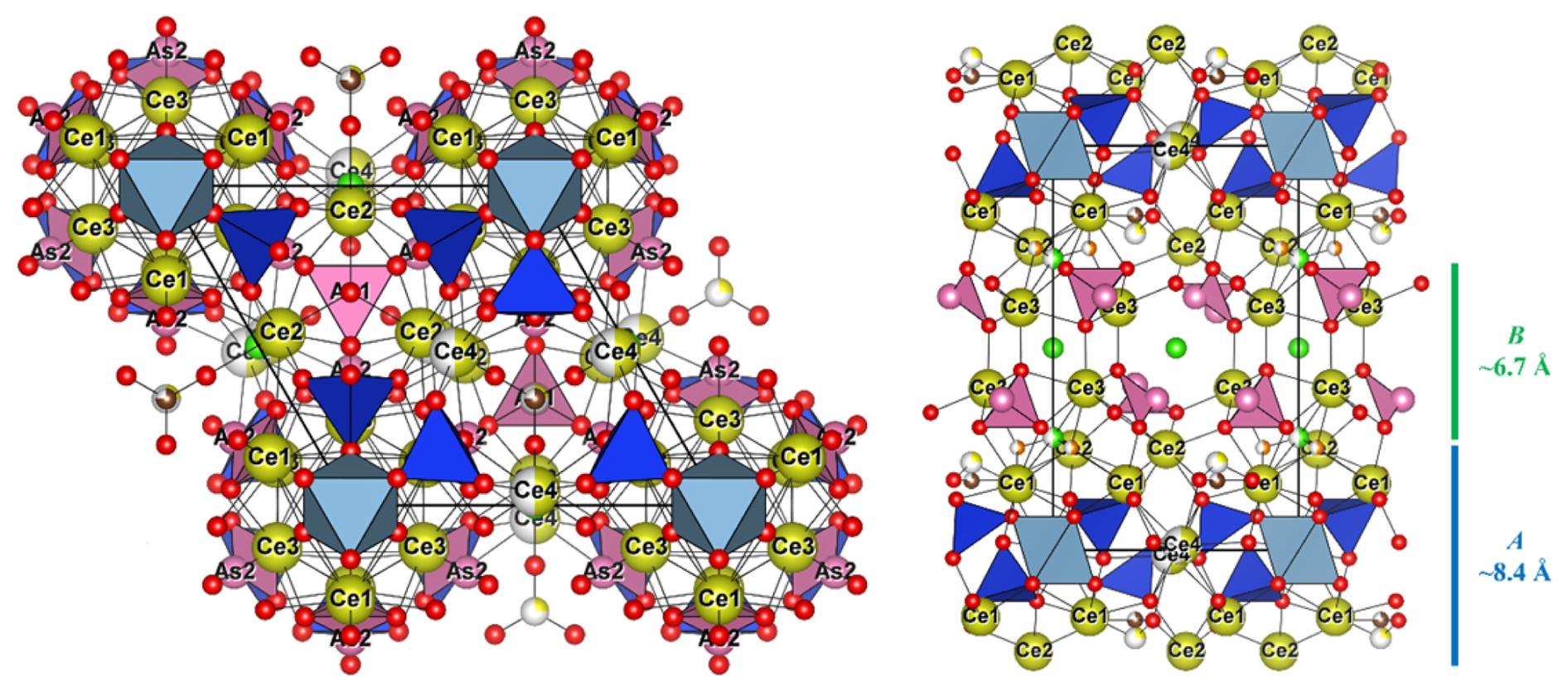Åsgruvanite-(Ce) is classified as a nesosilicate and belongs to the Strunz group 9.AH. It exhibits a unique composition and crystal structure. While not precisely a layered topology, the structure of this mineral can be described as being made up of two distinct layers that alternate along the c axis (Figs. 8–10). The first layer (A) is ∼8.4 Å thick and has the following general composition: [(Ce12Ca3)AlSi6(C1.50S0.50)Σ2.00O30(OH)2]15+. The second layer (B) has a thickness of ∼6.7 Å, with the following general composition: [(Ce4Ca2)AsO24Cl4F3]15−. Together, the layers constitute the walls of tunnels running parallel to [100]. The tunnels alternatively host the Cl2 site and a vacant tetrahedron defined by four As3+. Arsenic atoms are located at the apex of two trigonal pyramids pointing towards the centre of the tunnels, sharing their basal edges with Ce2 (As1) and Ce1 and Ce3 (As2). The isolated Si tetrahedron is linked to the MO6 octahedron (M= Al0.55FeCr0.18) through one corner: due to the symmetry of these sites, this results in an octahedron with tetrahedra attached at each of its corners.