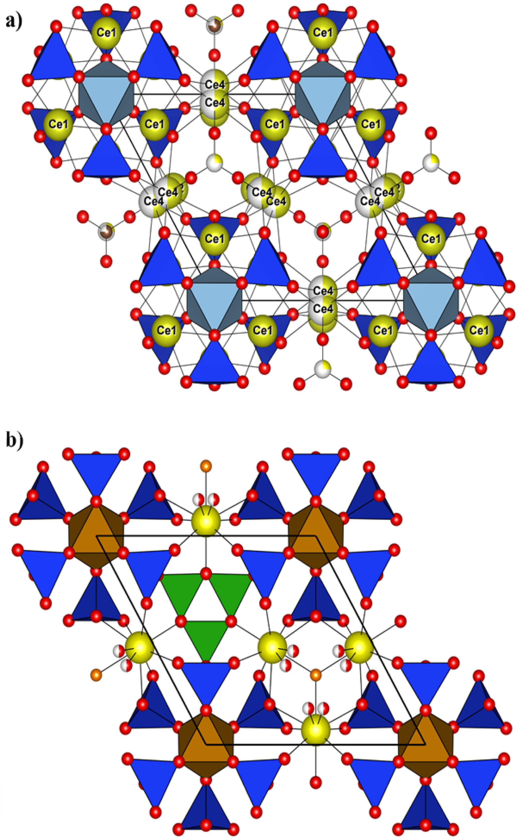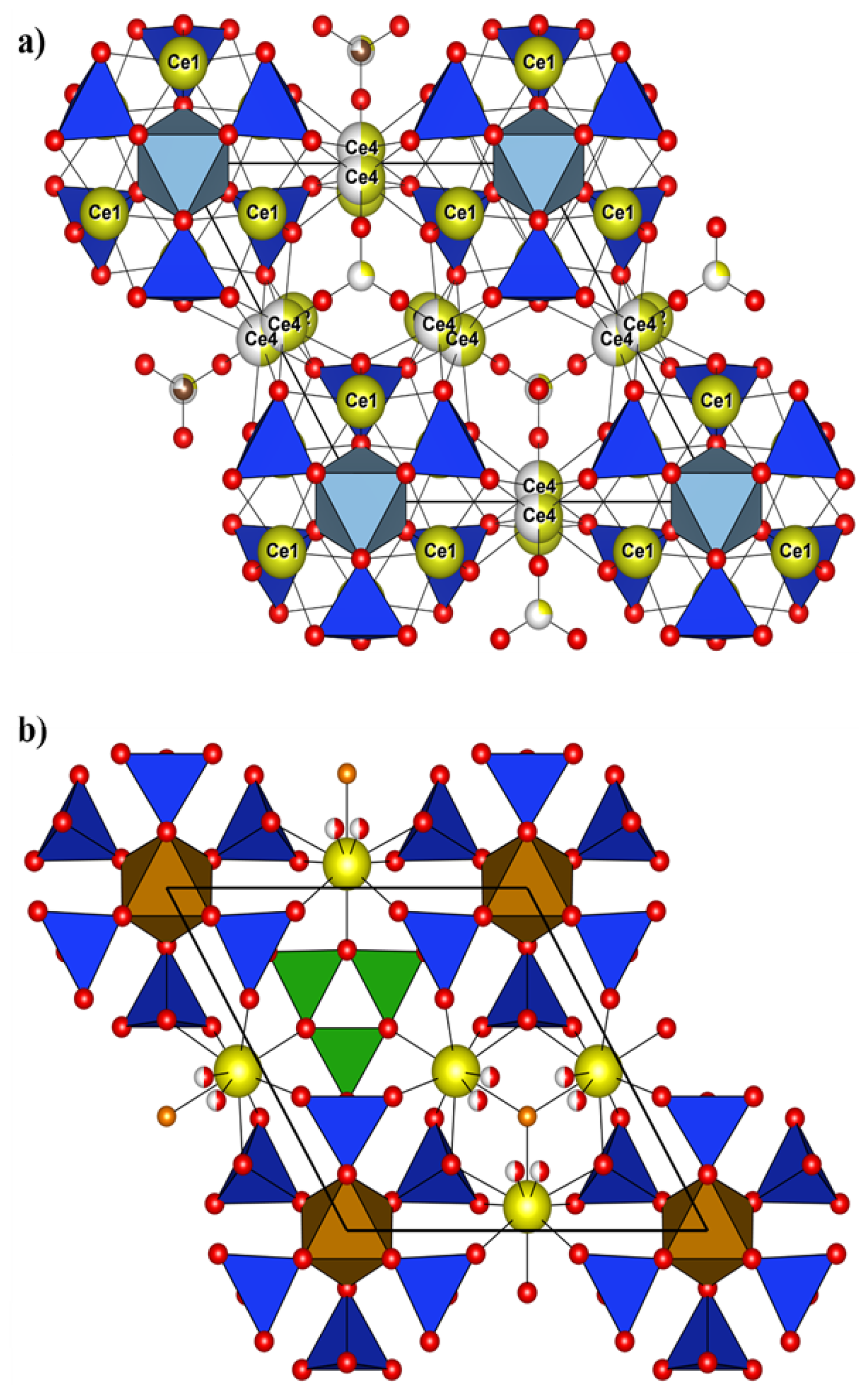 Figure 9(a) Crystal structure of åsgruvanite-(Ce): detail of the A layer along [001]; (b) detail of the A layer in vicanite-(Ce) along [001] (drawn with data from Ballirano et al., 2002). Symbols as in Fig. 8.