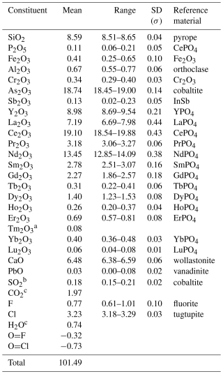 a Tm content calculated by interpolation between chondrite-normalised abundances of Er and Yb. b Assumed to be S4+ based on the geometry of the hosting site according to the structural data. c Calculated from structural formula, i.e. (Cl + F + OH) = 9 apfu and (C + S) = 2 apfu.