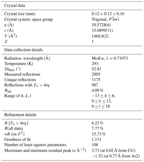 The crystal structure of åsgruvanite-(Ce) shows no relation to other known compounds. As shown in Table 3, there are four distinct cation sites hosting mixed REE–Ca atoms, one of which (Ce4) is half-occupied due to stereochemical constraints (the Ce4–Ce4 bond distance, 0.878 Å, is too short to permit full occupancy): two are As3+ trigonal pyramids, one is an isolated Si tetrahedron, and one is an M octahedron. In addition, two split sites were observed: the first one displays a trigonal–pyramidal coordination when it hosts S (∼25 %) or a triangular–planar coordination when it hosts C (∼75 %). The second split site hosts anions, namely 50 % Cl and 50 % F. In this case, the splitting involves different Wyckoff positions with different multiplicities; of course, both C and S and Cl and F are mutually exclusive as, if present simultaneously, they would be too close to each other. Given the presence of a half-occupied site (Ce4) and other disorder in the structure (as evidenced by the two split sites described above), the crystal was re-checked by means of SC-XRD with longer exposure times, but neither superstructure reflections nor weak, diffuse scatterings were detected. Furthermore, alternative space groups – both centrosymmetric () and non-centrosymmetric (P3 and P3m1) – were tested (also taking into account the presence of merohedric twinning for acentric groups; see below) but did not yield significant differences or highlight specific inconsistencies.
