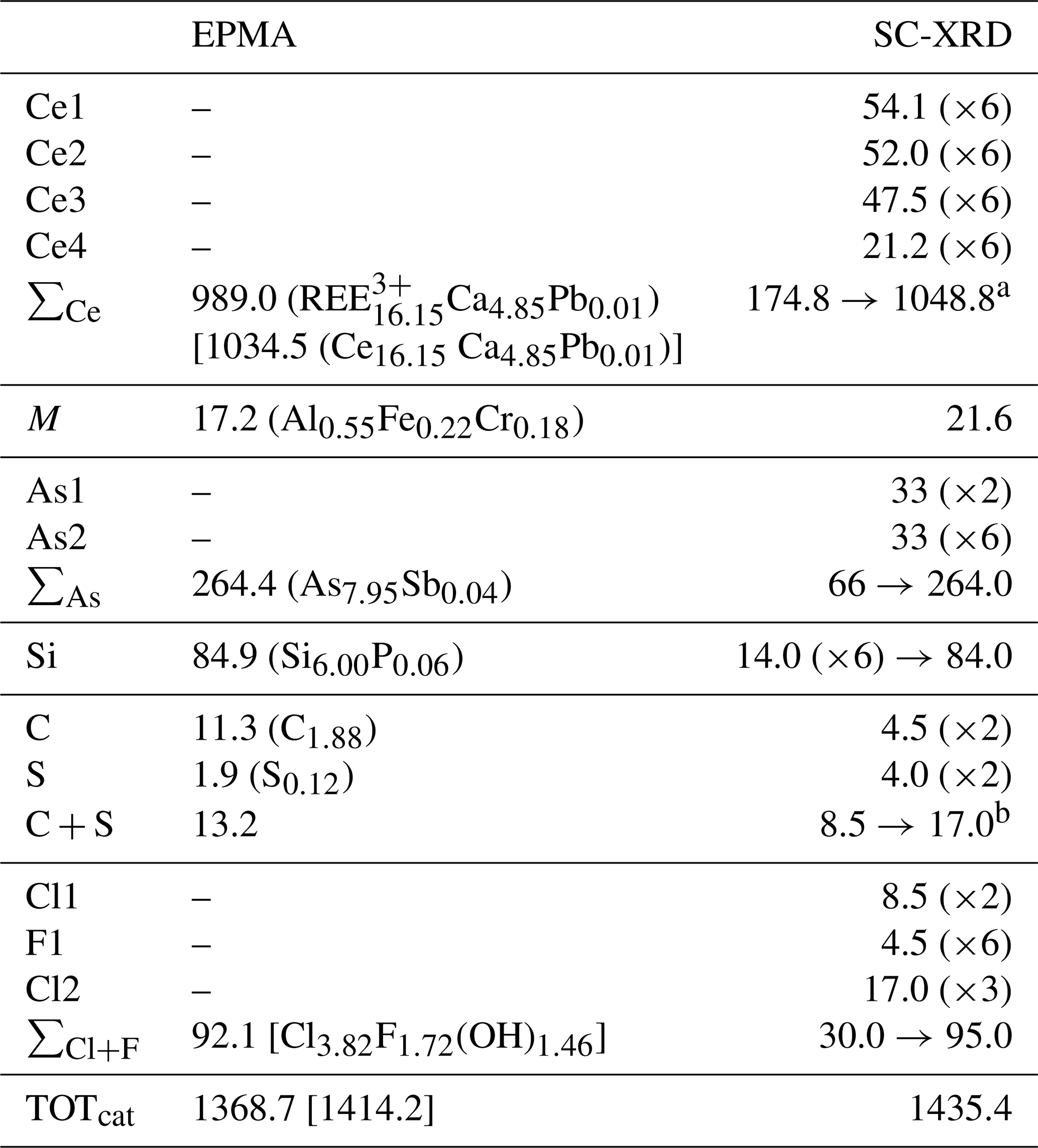 The formula obtained from the structural model, (CeCa4.46□3)Σ24(Al0.34Fe)Σ1Si6As(C1.5S0.5)Σ2 O54[Cl3(Cl□)(F3□3)(OH)2]Σ13, is in fairly good agreement with the empirical formula obtained from microprobe data.