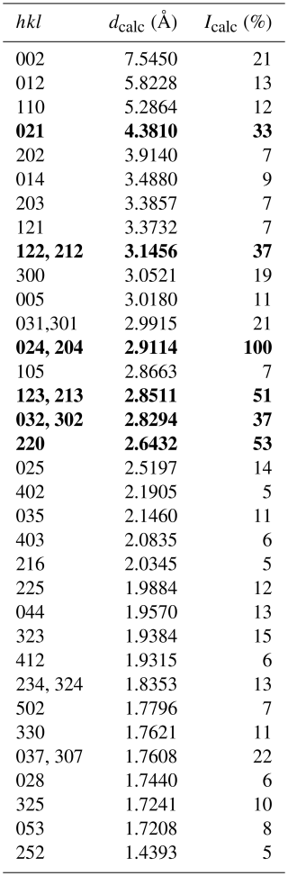 Note that only reflections with Icalc>5 % are listed. The calculated diffraction pattern is obtained with the atomic coordinates and site occupancies reported in Table 3.
