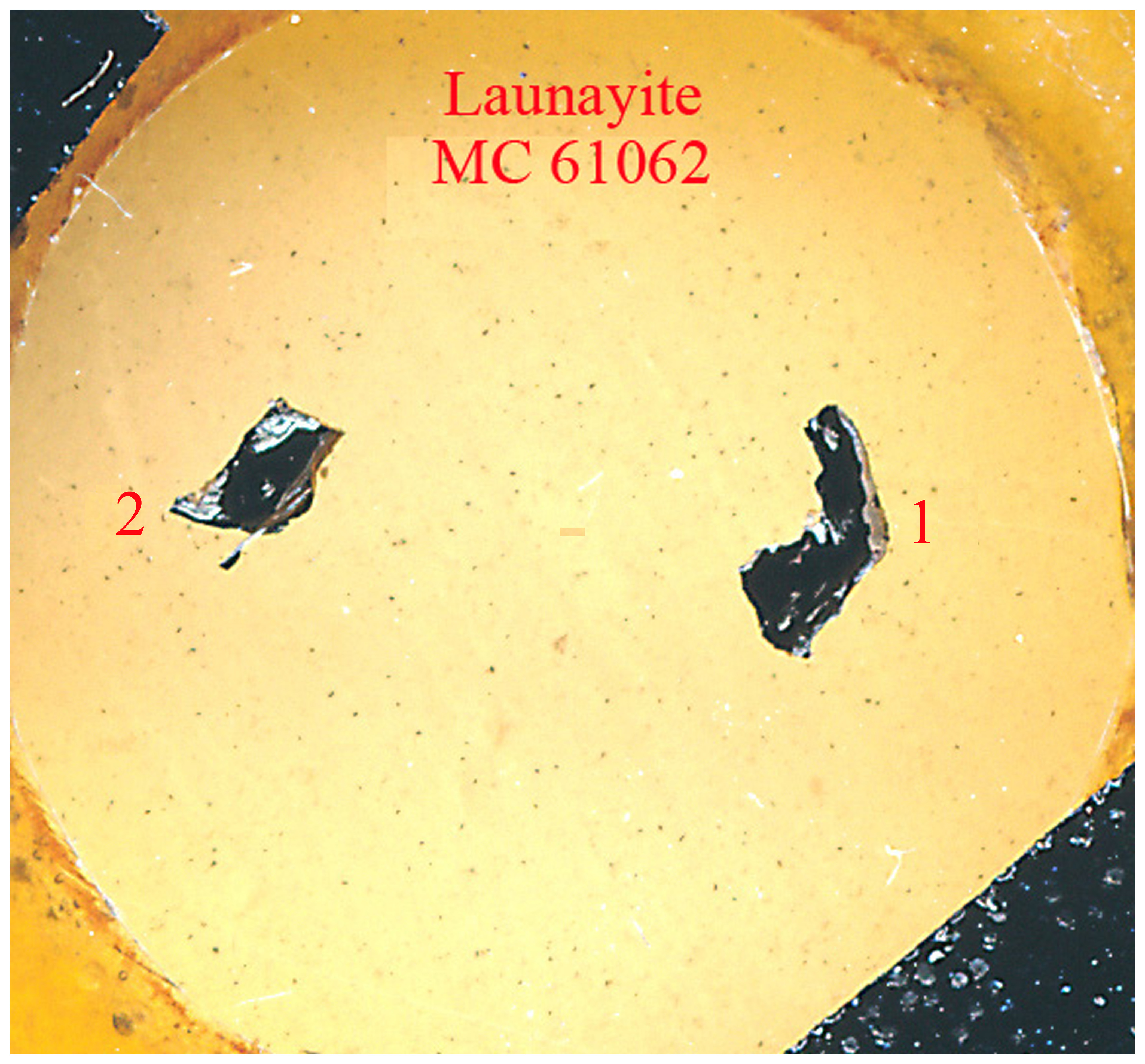 Figure 1Photograph of the polished type specimen of launayite with catalogue number MC 61062, from Taylor Pit, Madoc, Ontario, Canada, showing two black sulfosalt aggregates (ca. 2×3 mm in embedding material) containing launayite.