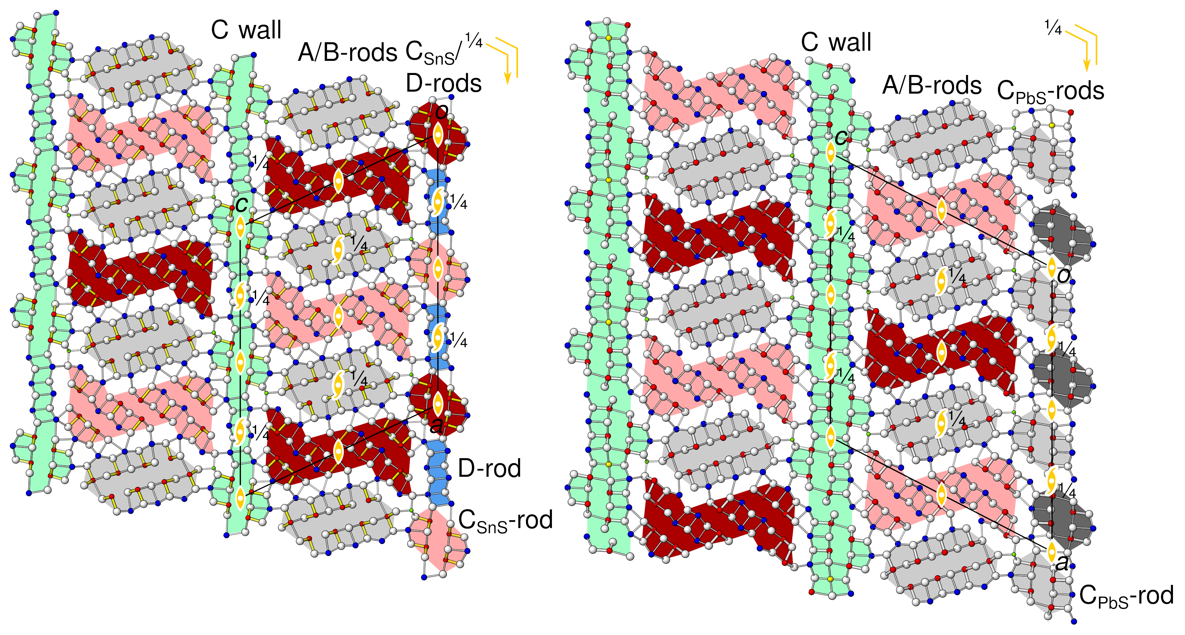 For deeper insights into the difference between the C walls, it is useful to adopt a rod-based perspective. In rouxelite, the C walls have been decomposed into PbS-based C rods by Topa et al. (2025), as shown in Fig. 4 (right). To avoid confusion between the C wall and C rods, the meaning will henceforth always be specified. Moreover, we will indicate the archetype in the subscript and designate them as CPbS rods. The CPbS rods are located on general positions of the parent structure and can be seen as two double layers related by a 21-screw rotation resulting in pseudo-symmetry. Adjacent CPbS rods in rouxelite are connected by the Hg (+ minor Ag) and S rods with an additional Pb position (see uncoloured background in Fig. 4, right) described above. CPbS rods connected by Hg are at the same position with respect to [010], and those connected by the S rods are translated by .