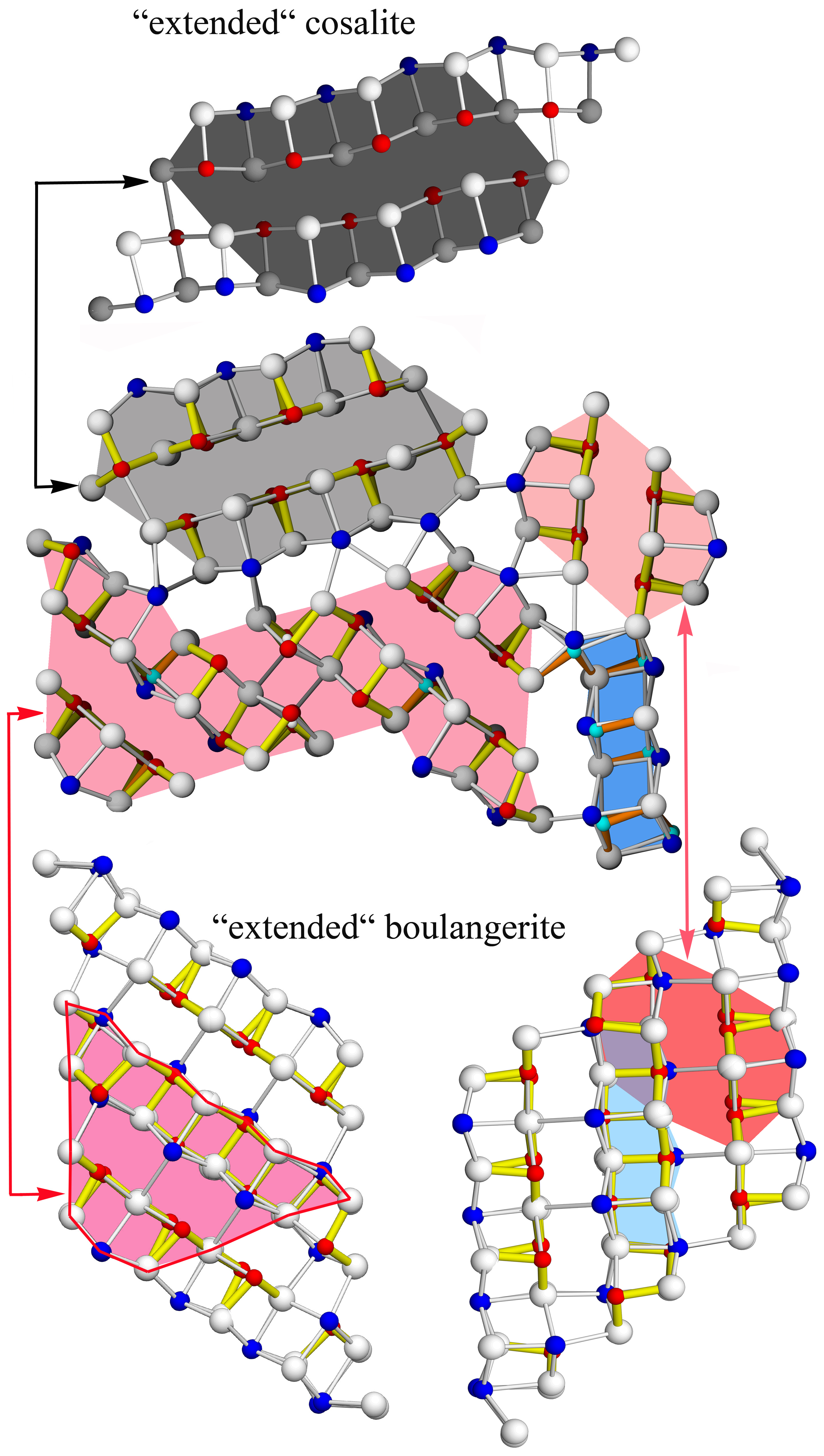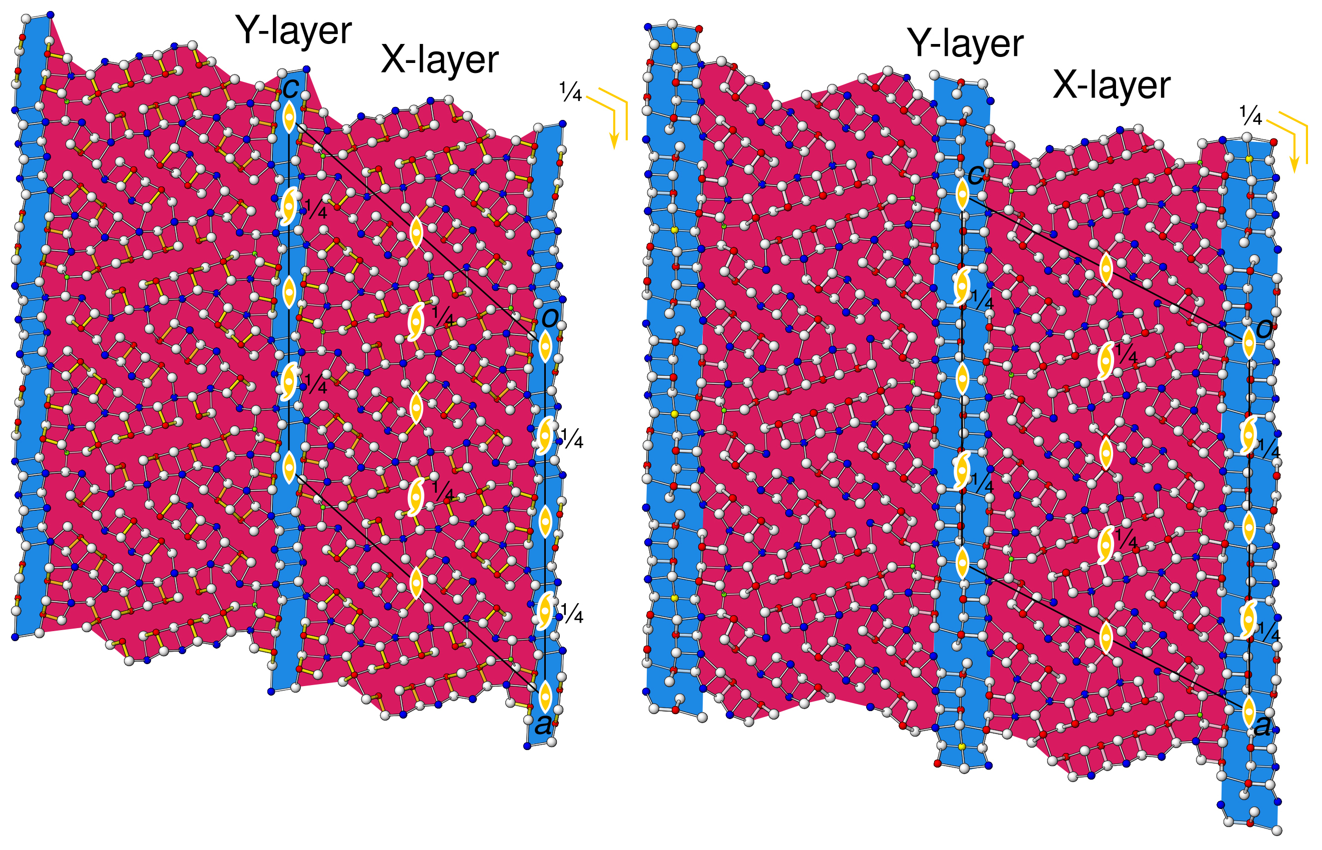The description above was given with respect to modules of PbS- and SnS-like archetype structures. From a polytype/merotype approach, a different picture is obtained. Thereto, we consider the features/atomic positions that both structures have in common: foremost, the A/B layers, but also the protuberances of the C walls and the tetrahedrally coordinated Cu atoms. These are combined to layers X with symmetry, as shown with a red background in Fig. 5. The remaining atoms are attributed to layers Y, again with symmetry (blue background in Fig. 5), which correspond to the C walls without the protuberances. Here, from a symmetry point of view, both approaches are equivalent, and henceforth we will stick to the crystal-chemical interpretation. In other cases, though, both may lead to fundamentally different descriptions, as we have shown for owyheeite (Stöger et al., 2023).