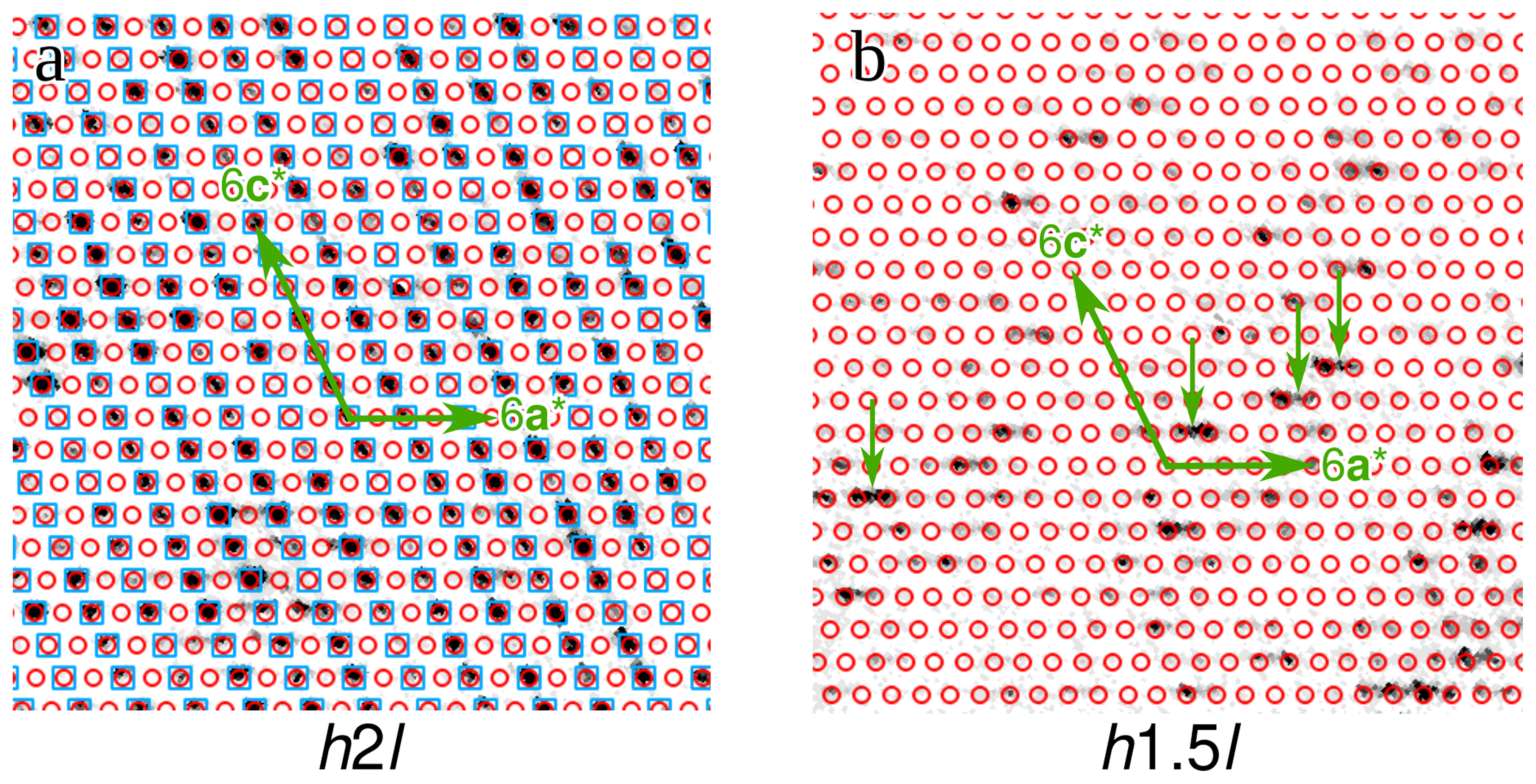 Launayite and rouxelite not only share structural features, but their diffraction patterns likewise show similarities. While in both cases the reflections corresponding to the parent structure are strong and well defined (Fig. 6a, blue squares), they possess additional superstructure reflections in the planes, which indicate a doubling of the b axis (Fig. 6b) and which can be assigned to multiple domains in both cases.