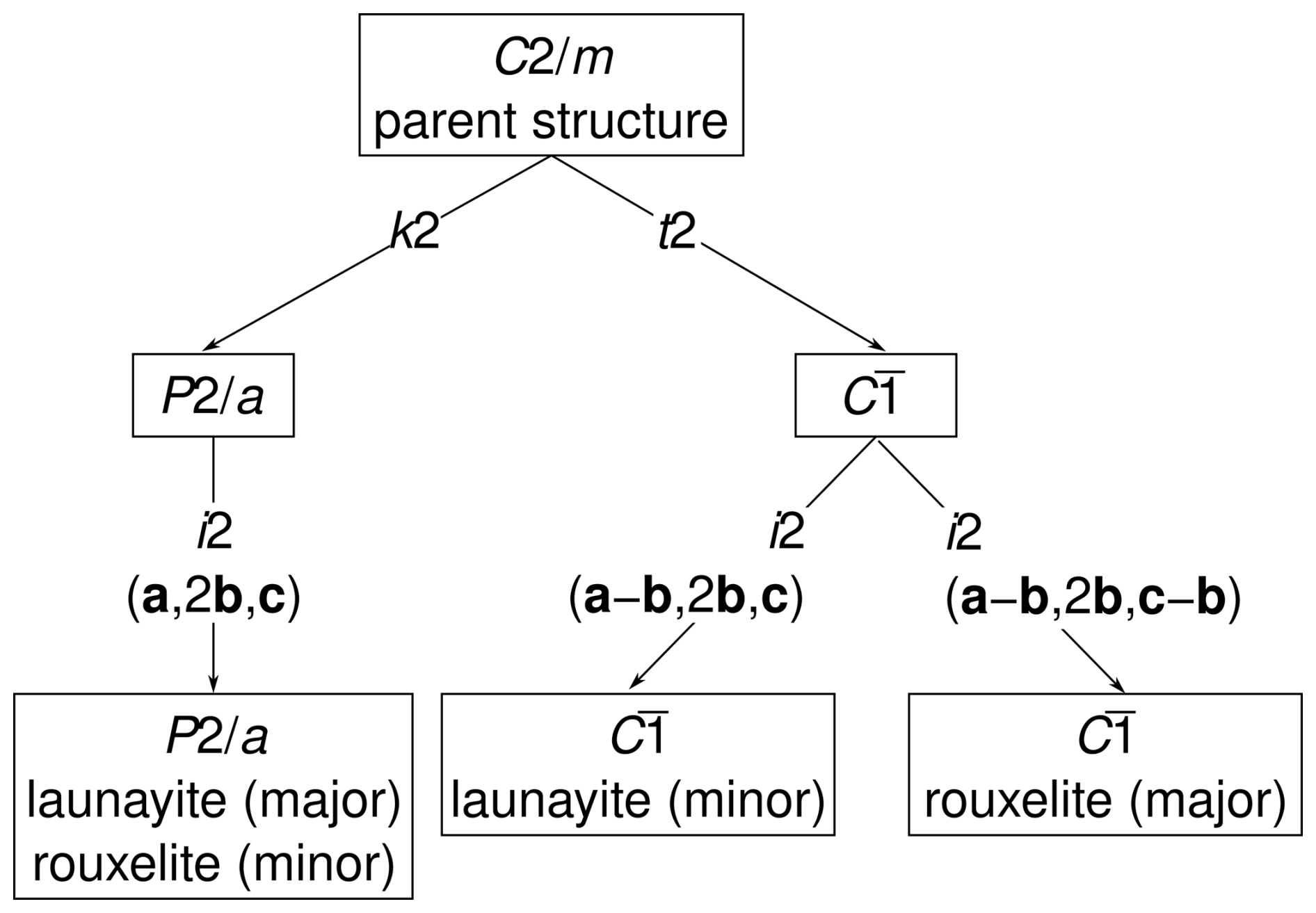 Figure 7Symmetry relationship between the simplified parent structures of launayite and rouxelite and the three observed superstructures.