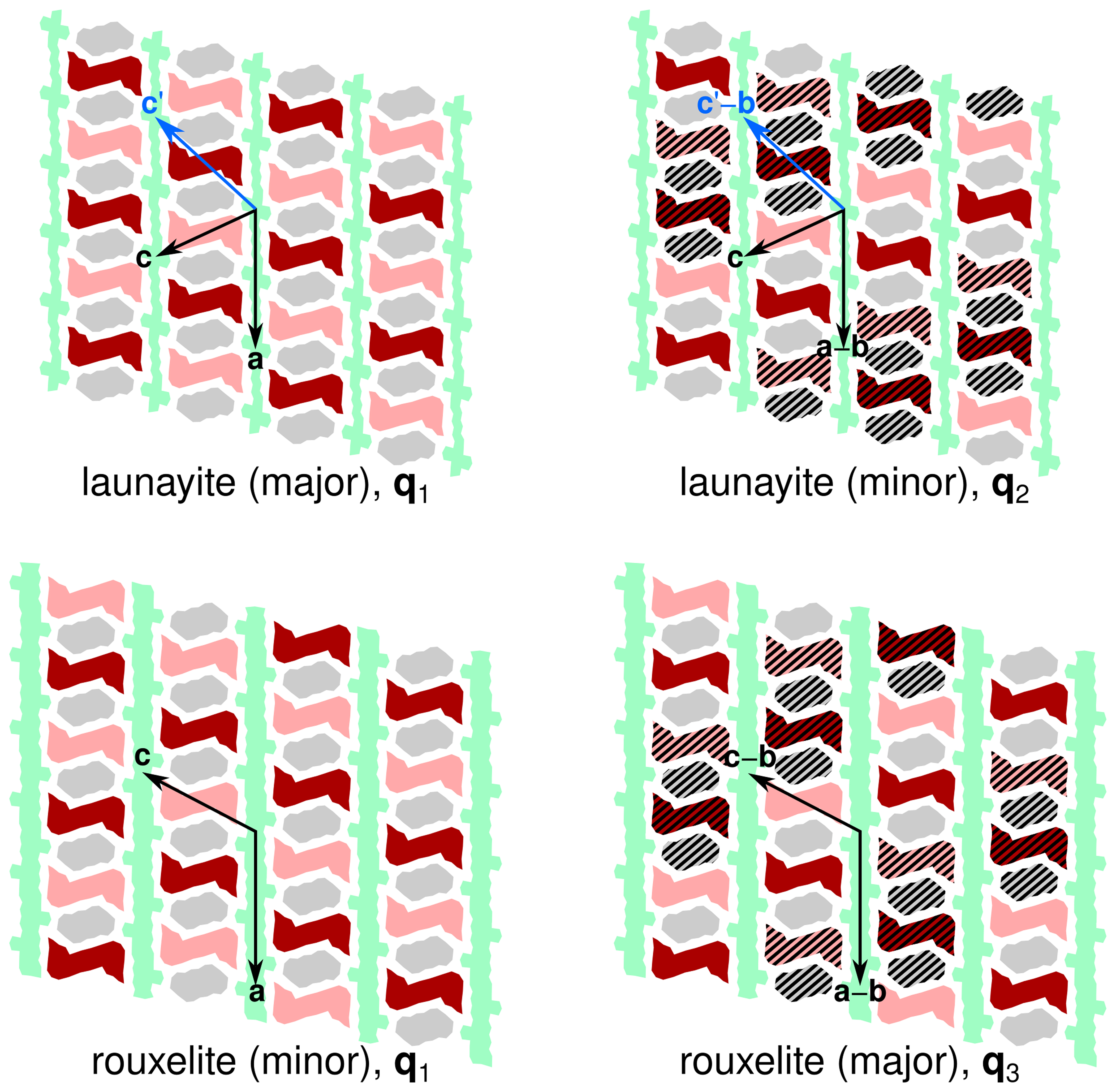 The launayite structural data presented here are based on the q1 monoclinic structure. The same superstructure was observed for rouxelite, though as a minor domain (Topa et al., 2025). The dominant domains of rouxelite were a pair of triclinic twin domains with modulation wave vectors and .