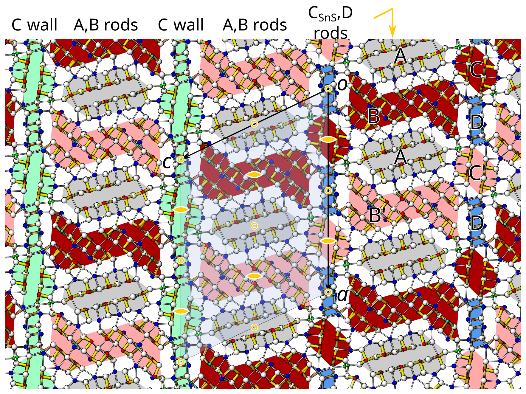 The major q1 superstructure of launayite is shown in Fig. 9. The reflection symmetry is lost, and the layer group symmetries of the C walls and the A/B layers are reduced to . The rod groups of the A modules are reduced to pb-1 (loss of the 21-screw rotation), and those of the B modules are reduced to pb121 (loss of inversion). The latter therefore appear in two orientations with respect to inversion, indicated by different shading in Fig. 9. In contrast, in the q2 and q3 superstructures, all rotational symmetry is lost and only centres of inversions remain. For details, see our recent publication on rouxelite (Topa et al., 2025).