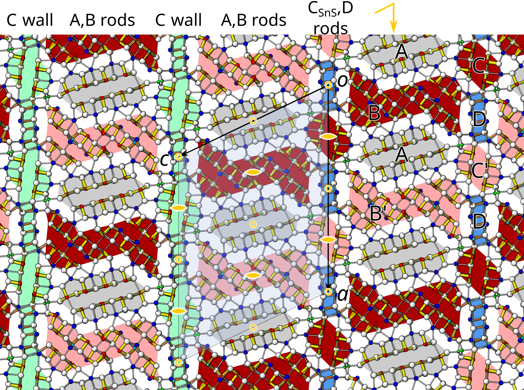 In summary, the superstructures are caused by a doubling of the translation period of the A and B rods in the [010] direction, and the cell and symmetry are due to the distribution of the origins of the A and B rods in the structure.