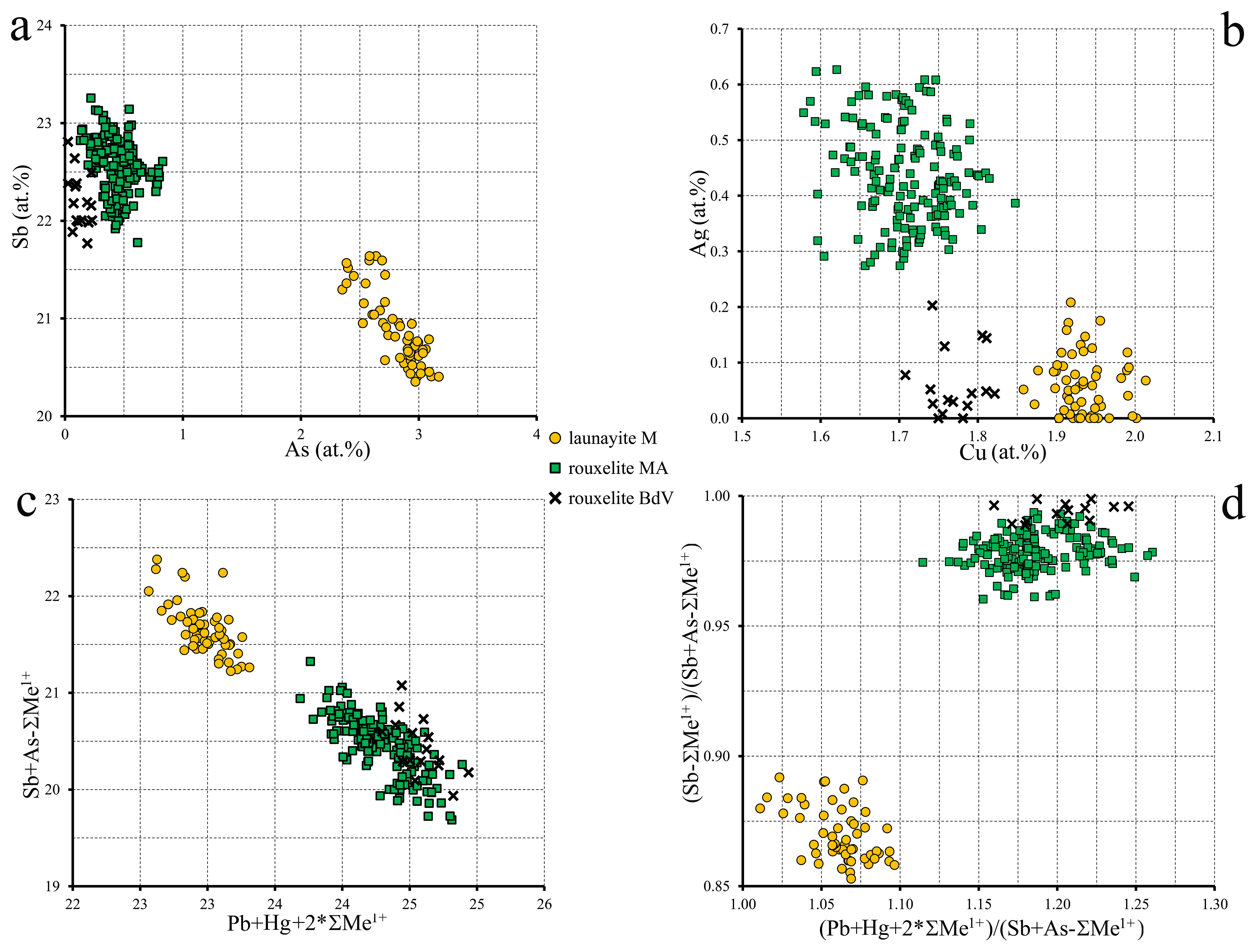 Figure 13Binary plots of relevant pairs of element content (a, b), expressed in at. % values, and of two combinations (c, d) of ΣMe2+ vs. ΣMe3+ ratios for chemistries of launayite and rouxelite. Me1+ does not contain Cu. In all these representations, launayite and rouxelite compositions are clearly separated.