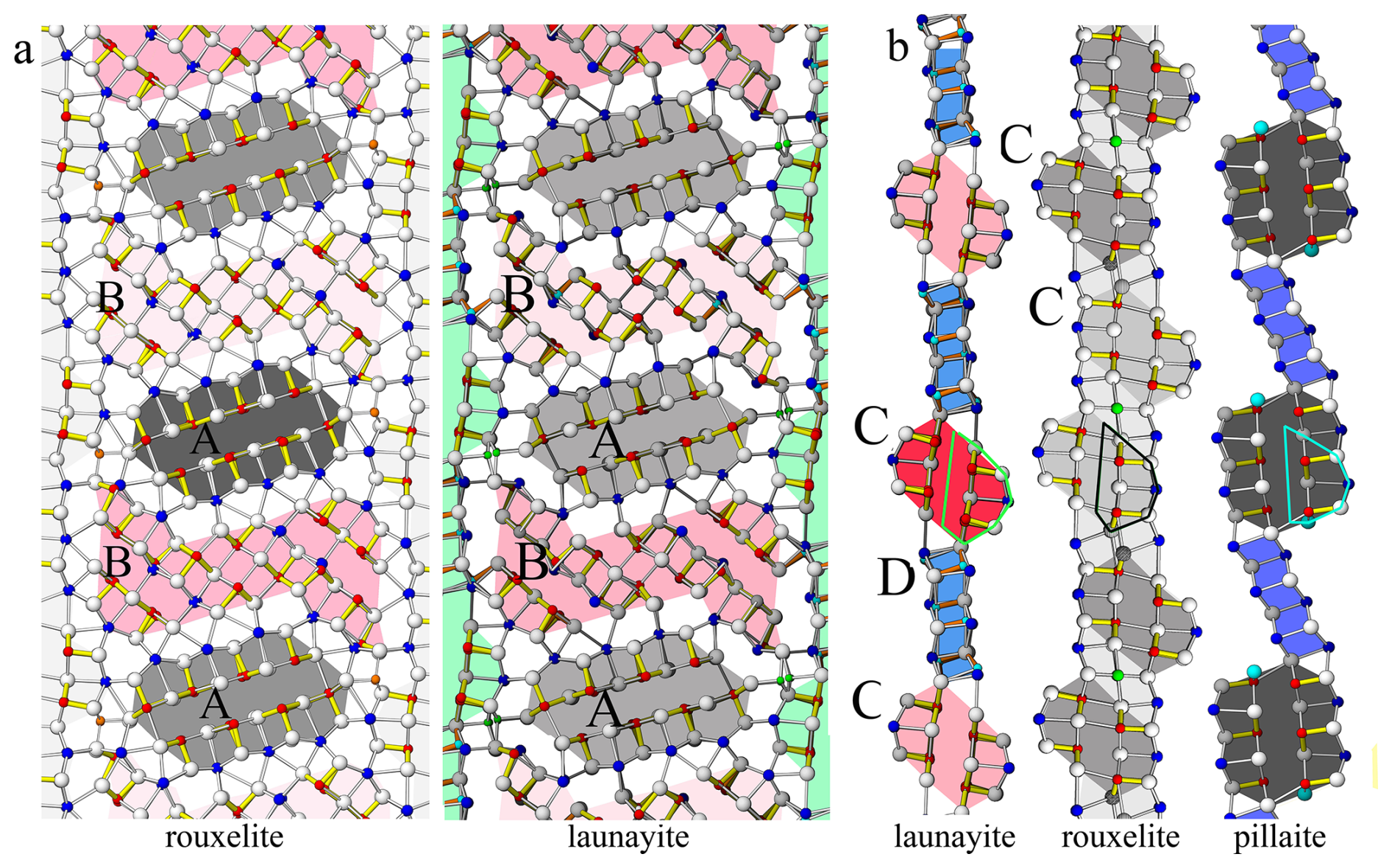In summary, the simplified parent structures of launayite and rouxelite are built of isotypic A/B layers and fundamentally different C walls. Thus, they can be considered members of a family of merotypes (Ferraris et al., 2008), a generalisation of polytypes, where members of a family share only a part of the layers and where other layers may differ.