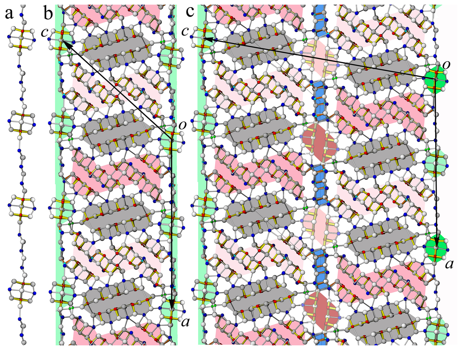 Figure 15(a) Module topology of launayite viewed down [010]. (b) Modules viewed slightly inclined to [010] showing connectivity. (c) Rods viewed perpendicular to [010] showing the archetype: A rod, PbS-like (grey); B and CSnS rods (red), SnS-like; D rod, undefined (blue).