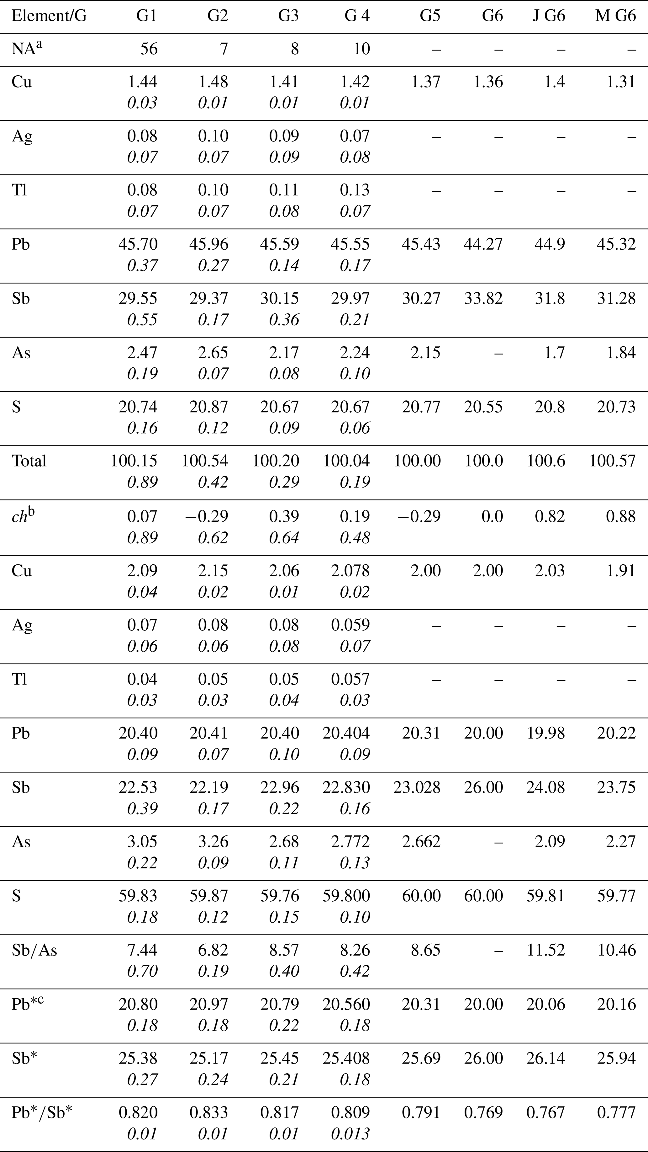 a Number of point analyses. b ch: charge balance values calculated as (Σcation valence − Σanion valence) using atom per cent values. c Pb∗ = Pb + 2(Ag + Tl + Cuextra), Sb∗ = Sb + As − (Ag + Tl + Cuextra) and Cuextra = Cu − 2, calculated using apfu.