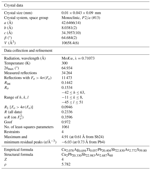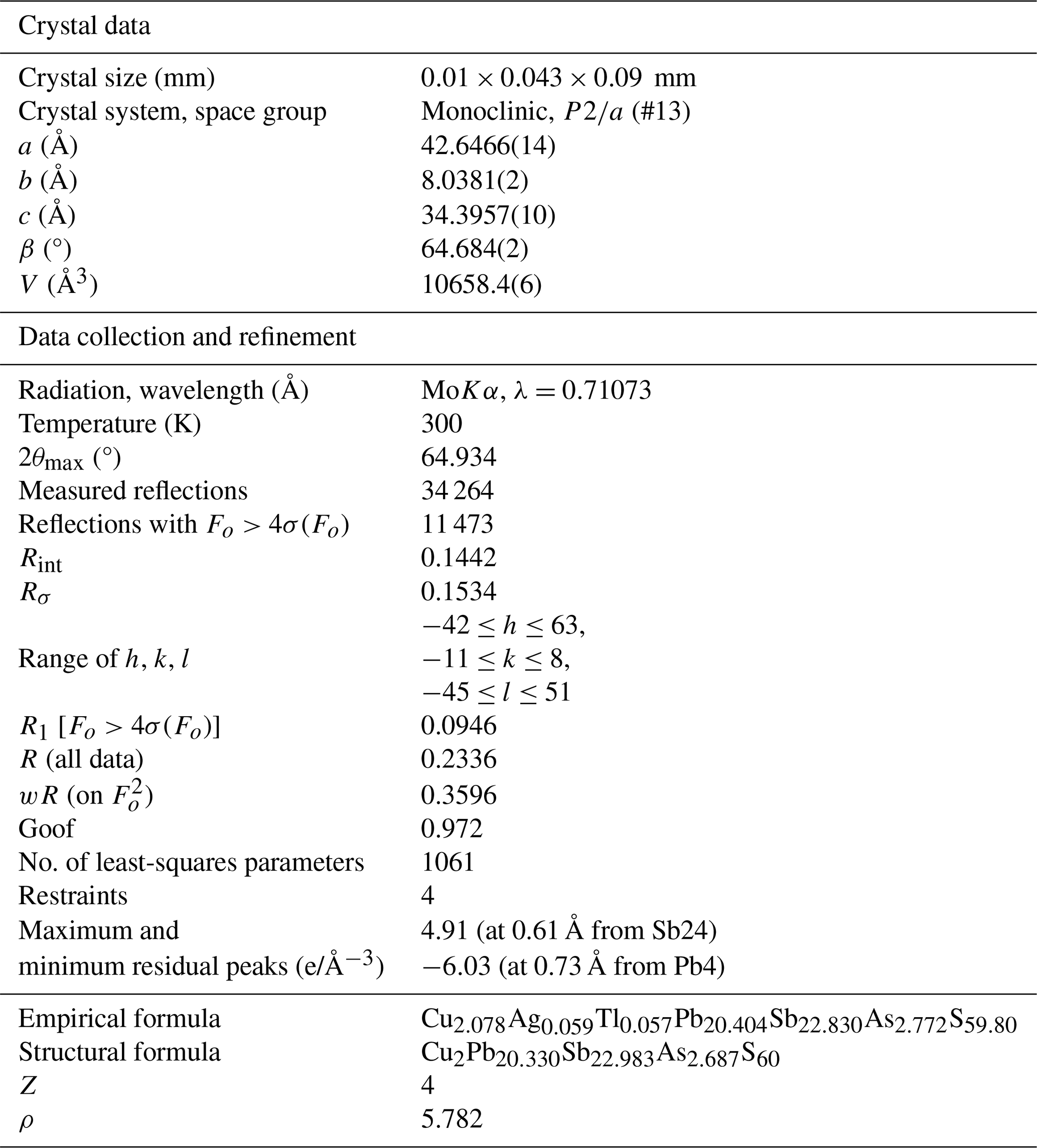 Final refinement led to R1=0.0946 for 11 471 unique reflections. The resulting structural formula obtained from SCXRD study for the asymmetric unit, Cu2Pb20.330Sb23.024As2.689S60, Z=4, is close to the EMPA empirical formula, Cu2.078Ag0.059Tl0.057Pb20.404Sb22.830As2.772S59.80. The validation of refinement process is given in the Supplement as S2_checkcif_launayite.pdf file.