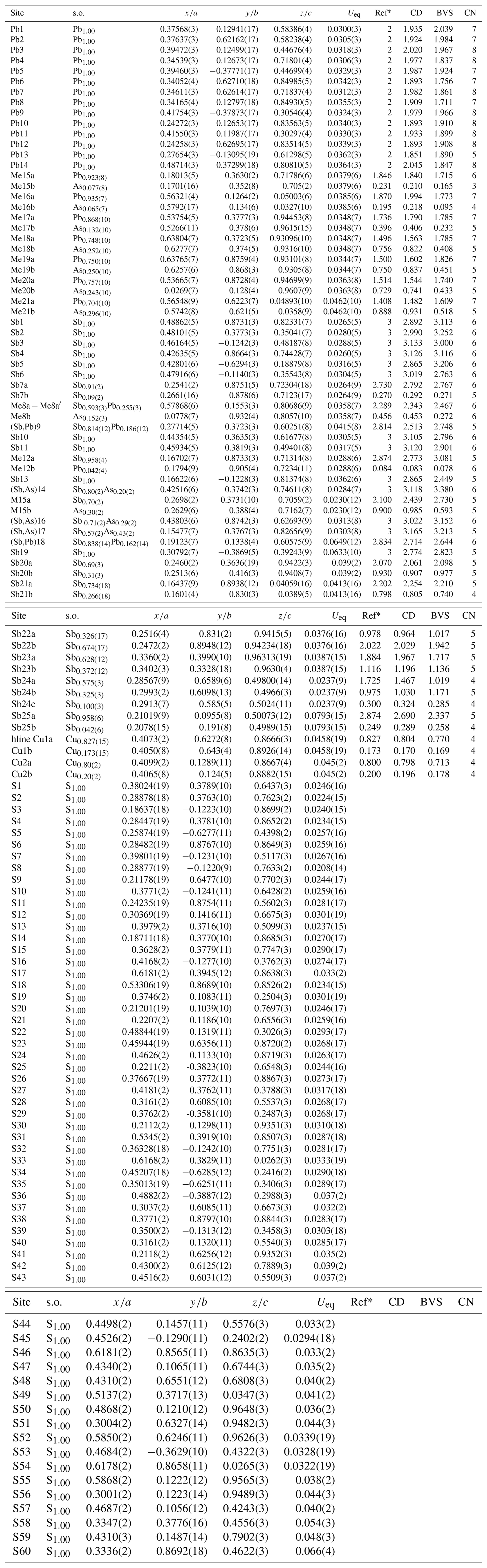 The asymmetric unit of launayite (Fig. 3) contains 48 cation and 60 anion sites. The metal sites consist of 21 Pb, 25 Sb, and 2 Cu positions. In total, 7 Pb sites are mixed with As (Me15 to Me21): 1 Sb site is mixed with Pb[(Sb,Pb)9], 4 Sb sites are mixed with As [(Sb,As)14, (Sb,As)16, (Sb,As)17, and (Sb,As)18], and 10 Sb sites are split (Sb7, Me8, Me12, M15, and Sb20–Sb25). Cu sites, Cu1 and Cu2, are both split as well (Table 3), and their CD and BVS suggest that Ag is not present at these sites. There are no As-dominant sites present in the structure. Although the (Sb,As)17 site contains a significant amount of As (Sb0.57As0.43), arsenic is not featured in the ideal formula of launayite.