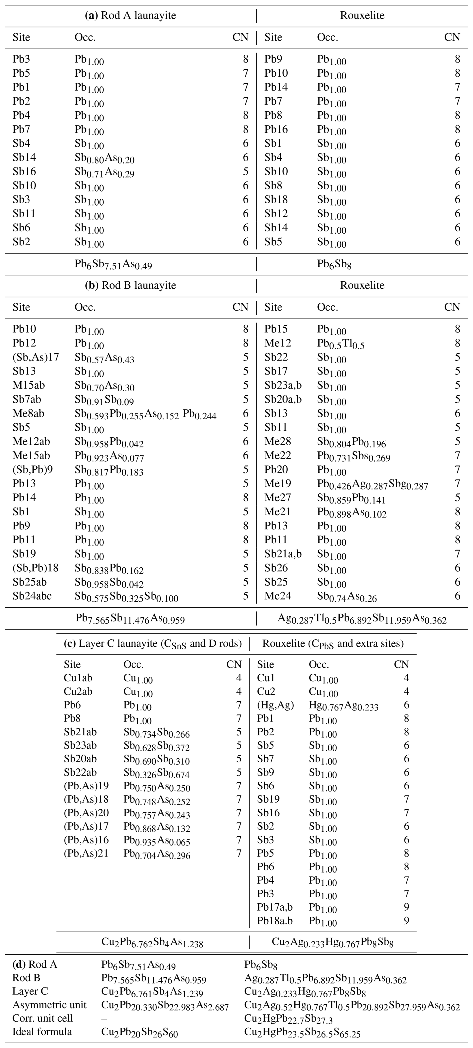 Table 7Independent sites and occupancies by rod type in the crystal structures of launayite from Taylor Pit, Madoc, and rouxelite from the Monte Arsiccio mine, for Z=4.