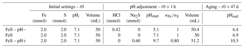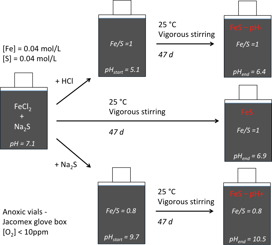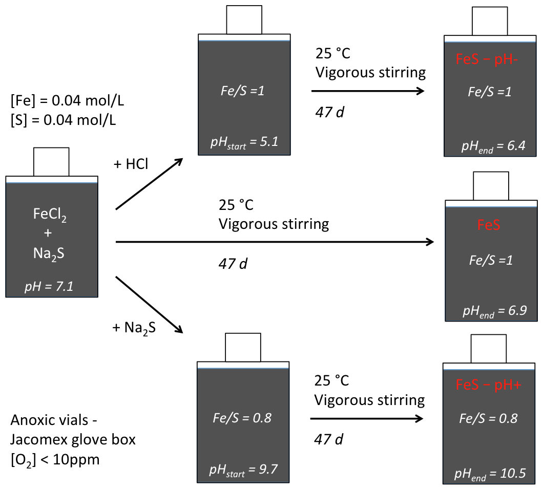 Figure 1Synthesis protocol for the three samples considered in this study. The control experiment, called “FeS”, consists of a simple aging experiment in aqueous solution of the solids initially precipitated from equimolar concentrations of Fe and S (ratio ), recovered after stirring over 47 d. In the FeS–pH− experiment, pH is initially lowered until pH 5.1 by adding anoxic HCl 1M. In the FeS–pH+ experiment, pH is initially increased until pH 9.7 by adding Na2S 0.625 M solution before the 47 d of aging, resulting in a final ratio of 0.8.
