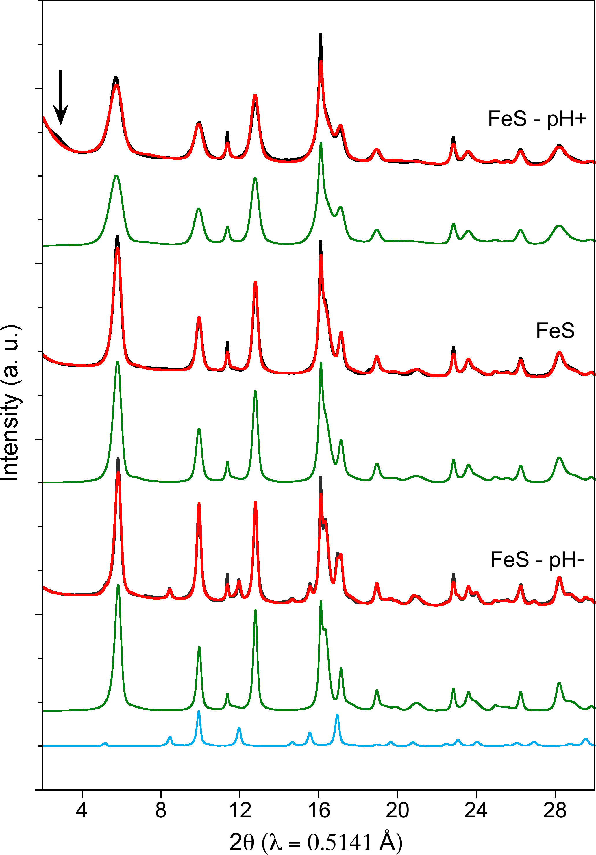 Both Rietveld and PDF analyses show that crystalline mackinawite is the unique component of the FeS and FeS–pH+ samples. In the latter sample pattern, an additional broad peak is observed at approximately twice the mackinawite d(001) distance, around 10–10.5 Å, as discussed in the next section.