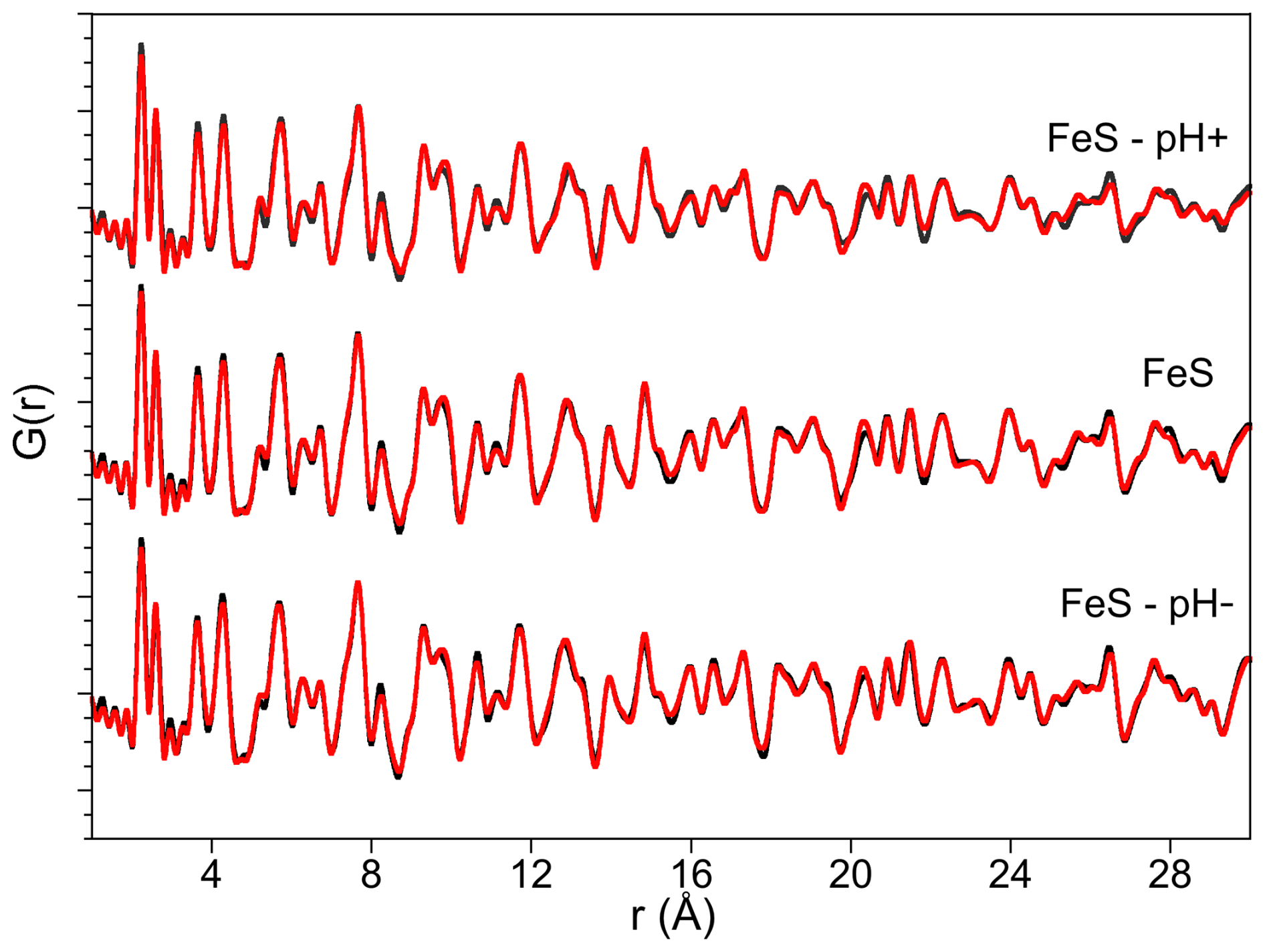 In contrast to the FeS and FeS–pH+ samples, the Rietveld and PDF analyses of the FeS–pH− sample reveal the additional occurrence of greigite. The Rietveld refinement indicates 19 wt % of greigite and 81 wt % of mackinawite (Table 2). These proportions are confirmed by the PDF analysis that also indicates no additional contribution of species not detectable by X-Ray diffraction in the samples (Fig. 3, Table 2). The X-ray fluorescence measurements performed on the three samples under strictly comparable conditions show that the FeS–pH− sample has a higher S content compared to the FeS and FeS–pH+ when all of the spectra are normalized to the Fe Kα emission line (Fig. S1). This chemical result is in agreement with the mineralogical results since a mixture of 19 wt % Fe3S4 and 81 wt % FeS is expected to show a lower Fe–S ratio than a sample made of 100 % FeS. This suggests a release of aqueous Fe(II) in the aging solution of the FeS–pH− sample.