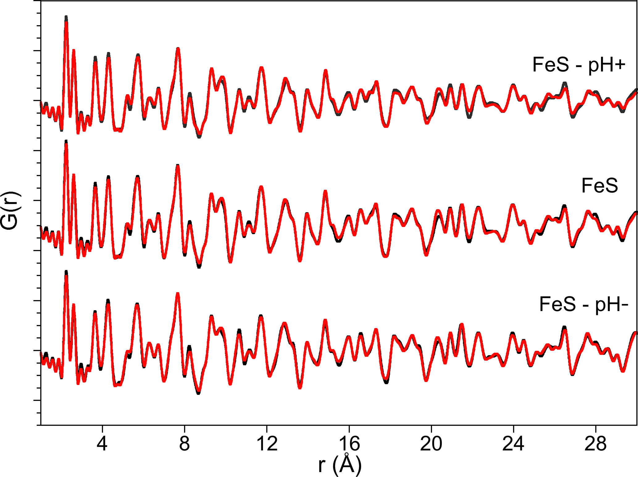 For the control experiment labeled FeS, the final pH of 6.9 was close to the initial one of 7.1, showing that only small variations occurred during the 47 d of mackinawite aging in aqueous solution (Table 1). In the case of FeS–pH−, the solution pH, initially set to 5.1 after HCl addition, was observed to re-equilibrate to 6.4 by the end of the experiment, which indicates H+ consumption (Table 1). In the case of FeS–pH+, the pH increased from 9.7 just after Na2S addition to 10.5 at the end of the experiment (Table 1). Given the molarity of Na2S introduced in excess (0.6 mmol, Table 1) to initially increase the pH in this experiment, the final pH value is expected to be 10.7, which is close to the final value measured. Thus, we observe a lag phase before the re-equilibration of pH close to the expected value after the 47 d of aging, possibly due to complex interactions between the added Na2S solution and FeS solids already present in the solution at the initial stage. The XRD powder patterns of the final solids, together with their corresponding Rietveld-refined patterns, are shown in Figs. 2 and S2a, while the PDF of the final solids and their associated refinements are shown in Fig. 3. All refined parameters are given in Table 2.