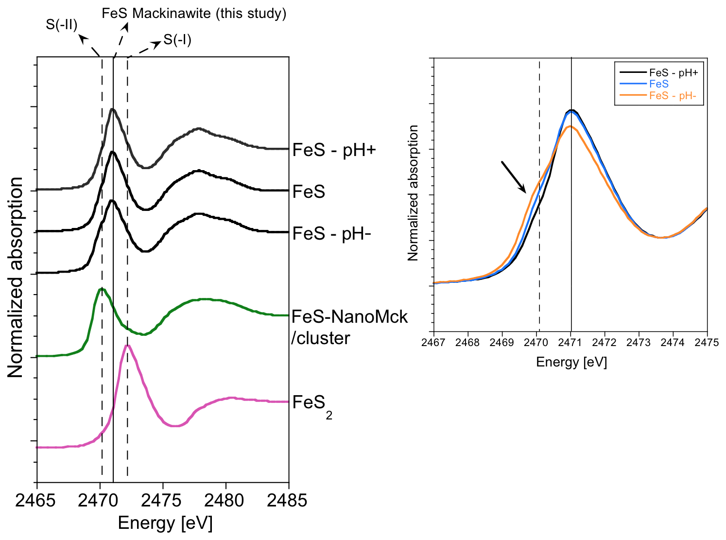 Figure 4XANES spectra at the S K edge for the three samples studied and for spectra of reference compounds corresponding to FeS (Ikogou et al., 2017) and nanocrystalline pyrite (Baya et al., 2021). A zoom on the pre-edge region shows a shoulder appearing in the pre-edge of the FeS–pH− sample, likely resulting from greigite contribution (19 wt %, Table 2).
