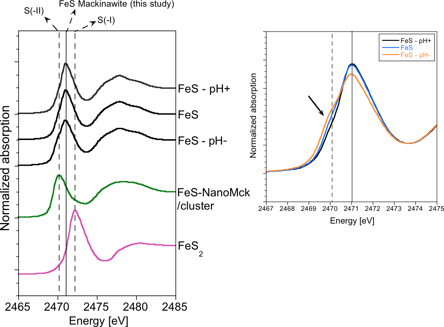 The fact that the occurrence of greigite in our FeS–pH− sample yields a shoulder at the same energy level as the main pre-edge peak energy of FeS (Fig. 4) suggests that this phase contains S atom sites with a XAS signature similar to that of FeS (i.e., with a formal valence of S(-II)). For instance, at the S K edge, this signature could be due to bonds with Fe(III) at tetrahedral A sites of greigite or bonds with mixed Fe(II)–Fe(III) at octahedral B sites, resulting in this covalent system in a fractional apparent oxidation state of between 2 and 3 for Fe (Pattrick et al., 2017). At the Fe K edge, the difference between our FeS–pH− and the two other samples is more subtle since this sample contains only 19 wt % Fe3S4. However, the comparison with the spectrum of Fe(III)-containing FeSNanoMck still stands, particularly considering the slight shift observed in the first maximum of the white line (Fig. 4).