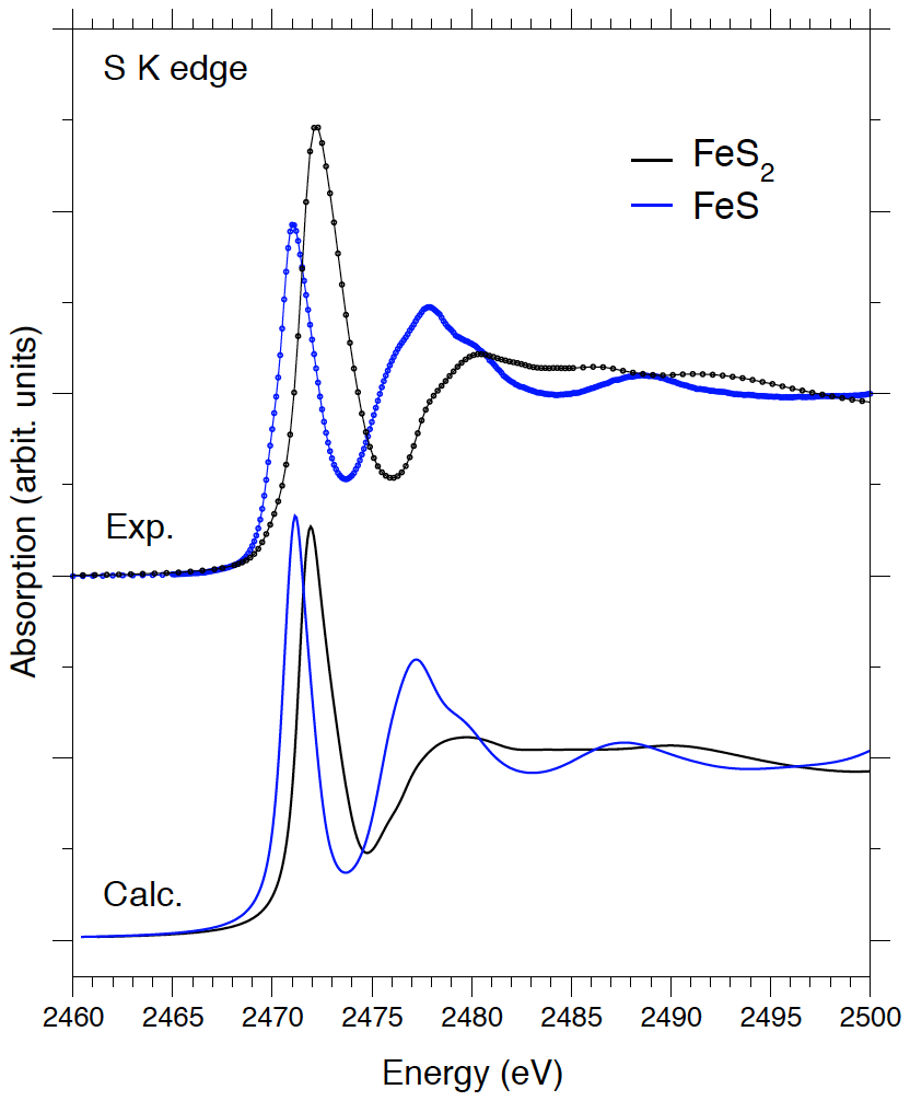 Figure 5Comparison between experimental and theoretical S K-edge of the FeS and FeS2 model compounds. A rigid energy shift has been applied to the theoretical spectra for a proper comparison with the experimental spectra.