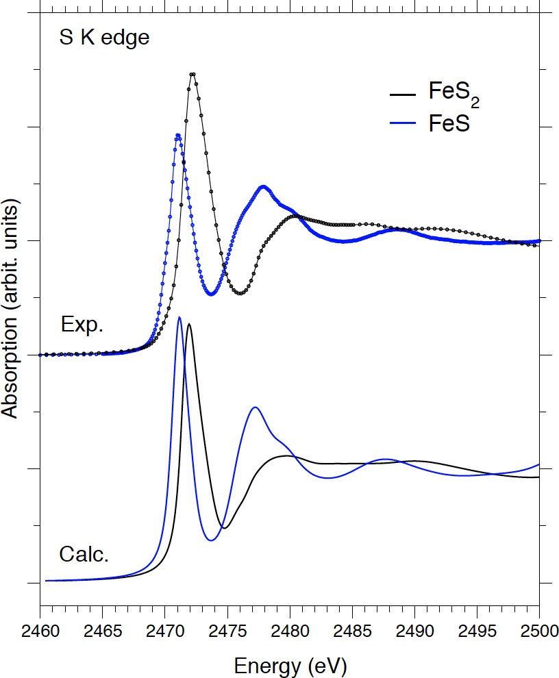 Ab initio calculations were performed using the Quantum ESPRESSO suite of codes (Giannozzi et al., 2017), implementing density functional theory (DFT) using pseudo-potentials, plane waves, and periodic boundary conditions. Ultrasoft pseudo-potentials were directly taken from the GBRV database (Garrity et al., 2014) for iron or were generated using the PSLIBRARY (Dal Corso, 2014) for sulfur, removing one 1s core electron from its electronic configuration when generating the pseudo-potential of the absorber in XAS. All calculations were performed within the generalized gradient approximation of Perdew, Burke, and Ernzerhof (GGA-PBE, Perdew et al., 1996) and with energy cutoffs for the electronic wave function and the density of 100 and 800 Ry, respectively. Self-consistent calculation of the non-magnetic electronic band structure of tetragonal mackinawite was carried out using the experimental crystal structure determined using Rietveld refinement of the experimental XRD pattern, a uniform Monkhorst-Pack k-point grid, and a Gaussian smearing of 0.01 Ry. X-ray absorption spectra at the S K edge were calculated as a continued fraction using the XSPECTRA module (Taillefumier et al., 2002; Gougoussis et al., 2009; Bunău and Calandra, 2013) in the full core-hole approximation, i.e., modeling the photoelectron as a uniform negative background charge in the supercell. An energy-dependent arctangent-like broadening, as given in de Clermont Gallerande et al. (2018), with parameters ΓH=1 eV, ΓM=10 eV, AC=20 eV, and AM=30 eV, was used in the continued fraction to obtain the X-ray absorption cross-sections plotted in this article. For mackinawite, the absorbing atom was isolated in a supercell containing 108 atoms, ensuring a spatial separation of ∼11 Å between the absorber and its periodically repeated images. Unit cell parameters a=3.6784 and c=5.046 Å and internal coordinate for S atoms u=0.256 were employed. Self-consistent field and XANES spectra were calculated using a k-point grid. For pyrite, the absorbing atom was isolated in a cubic supercell containing 96 atoms, using the unit cell parameter a=5.44 Å and the internal coordinate for S atoms u=0.386 (Baya et al., 2021). Self-consistent field and XANES spectra were calculated using a k-point grid and a k-point grid, respectively. Finally, the relative energy position of the S K edge was estimated using the ΔSCF procedure described in Lelong et al. (2014) and de Clermont Gallerande et al. (2018).