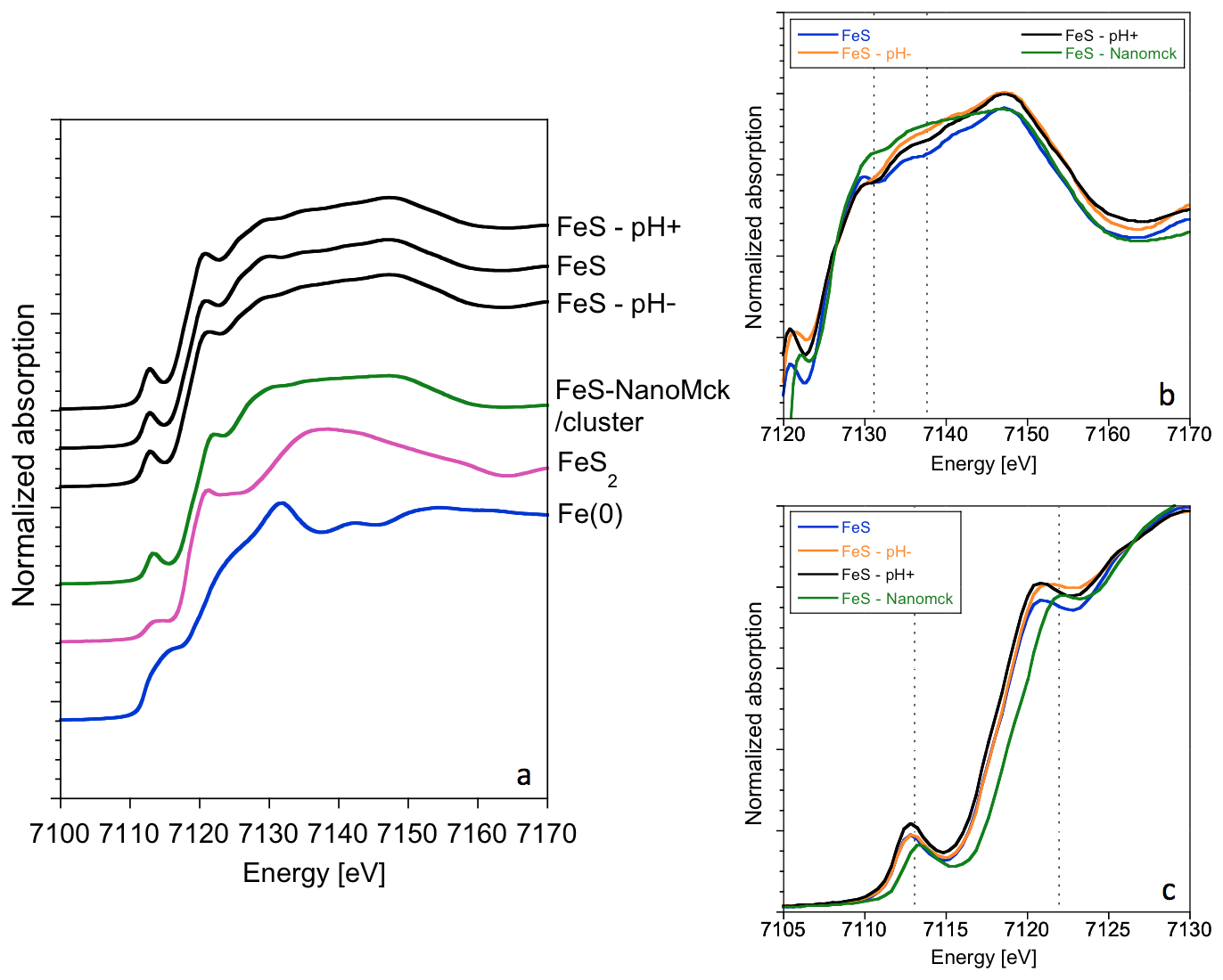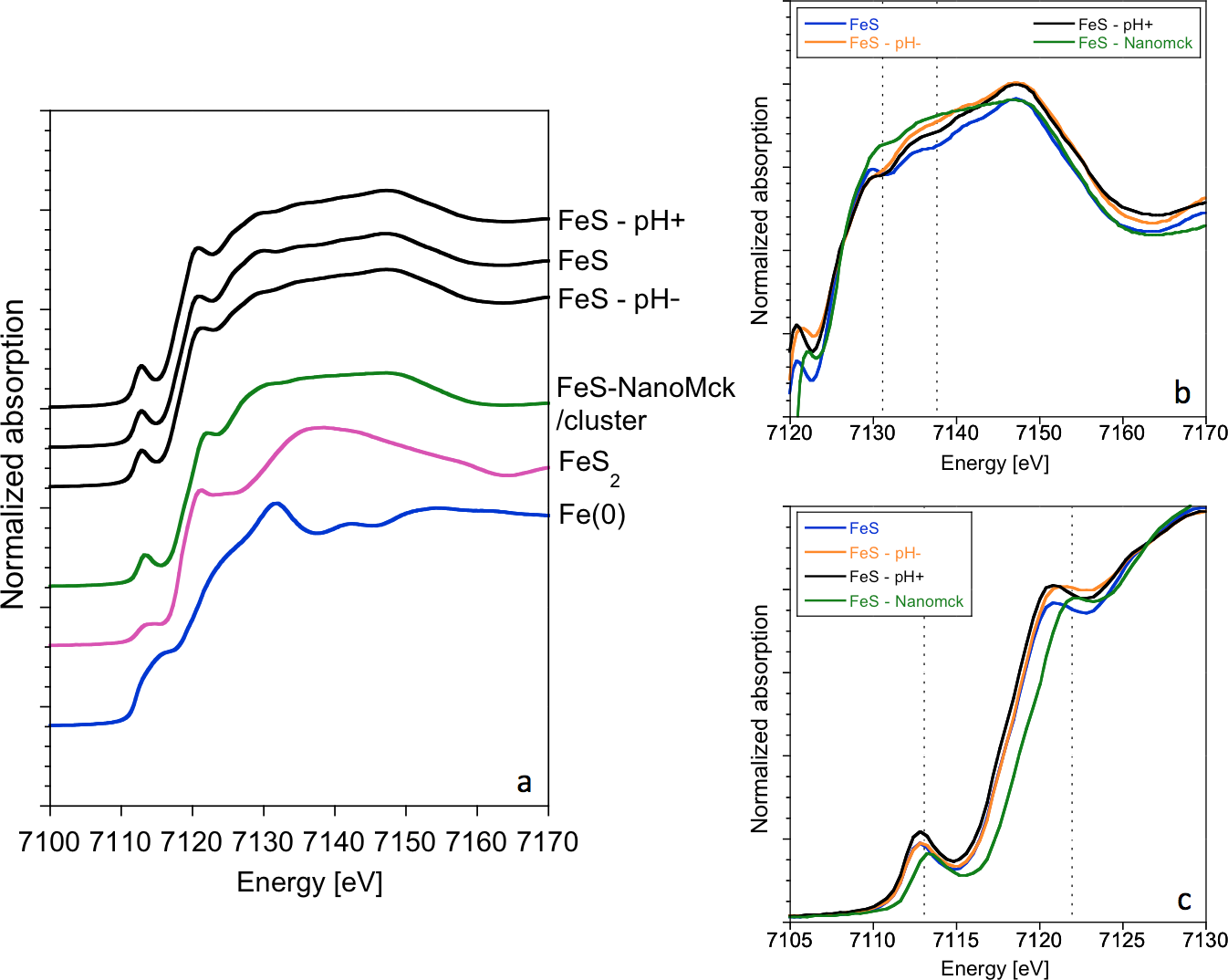 Figure 6(a) XANES spectra at the Fe K-edge for the three investigated samples and two reference compounds corresponding to FeS (Ikogou et al., 2017; Baya et al. 2021) and nanocrystalline pyrite (Baya et al., 2021). (b) Zoom on the 7120–7170 eV region of the edge and (c) zoom on the 7105–7130 eV region of the edge, showing that FeS–pH− has a close but different signal, likely due to the presence of greigite in the sample (19 wt %).
