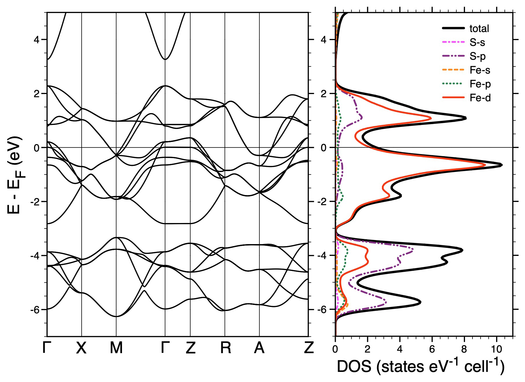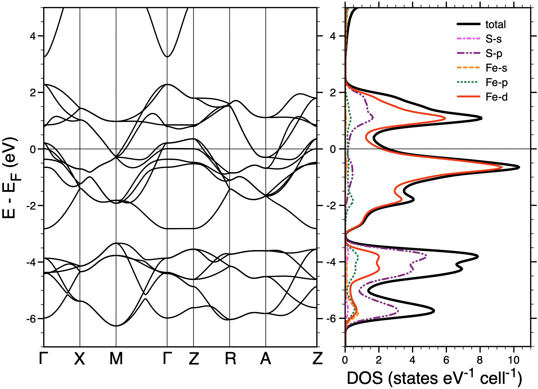 Figure 7Left panel: non-magnetic GGA-PBE band structure of FeS using the crystallographical data of Table 2 as inputs for FeS structure. Right panel: corresponding total, Fe, and S projected densities of states.