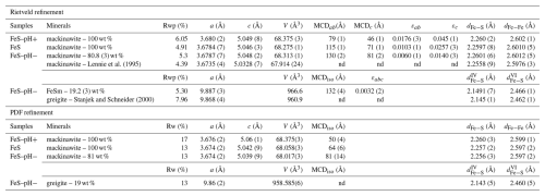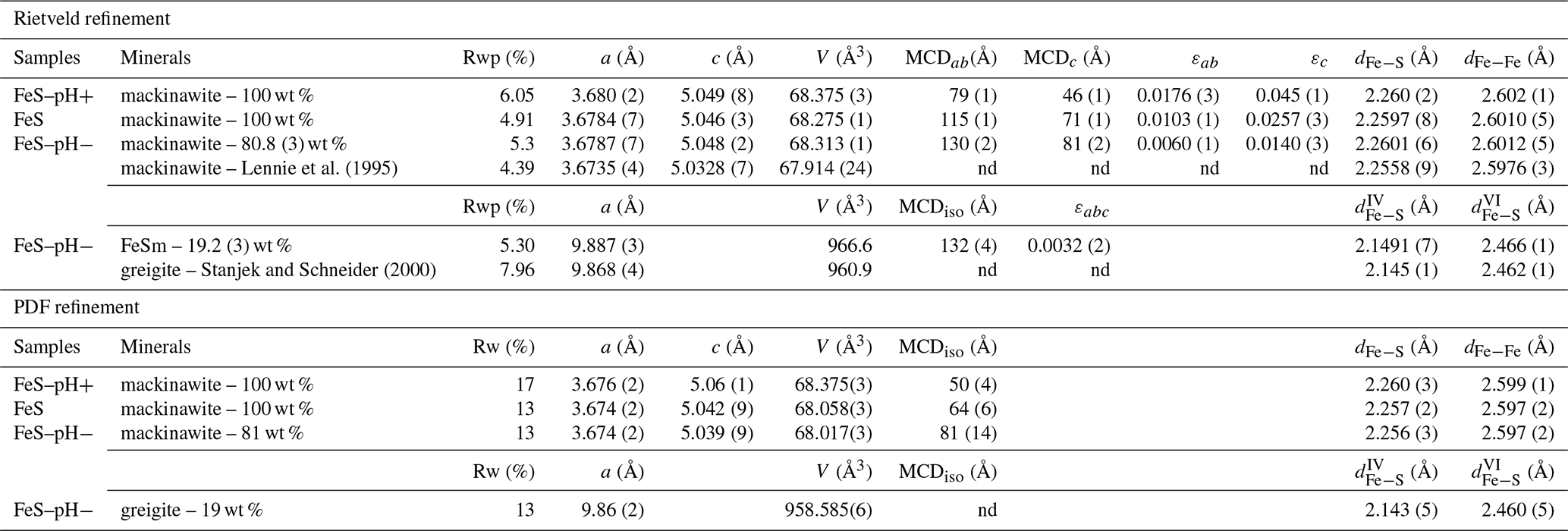 Table 2Refined parameters obtained for Rietveld and PDF refinements and associated calculated parameters. V is the unit cell volume, MCD values are the sizes of mean coherent domains, and ε denotes the calculated strain values. For mackinawite, dFe−S corresponds to the mean distance of Fe and S atoms in tetrahedron units, and dFe−Fe corresponds to the mean distance of two Fe atoms in the ab plane. For greigite, and are given, corresponding to the mean Fe S distances between Fe and S atoms for tetrahedral or octahedral coordinations, respectively.