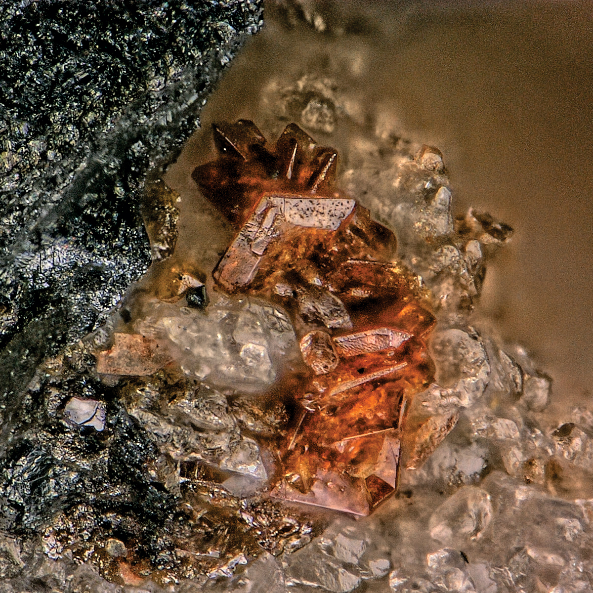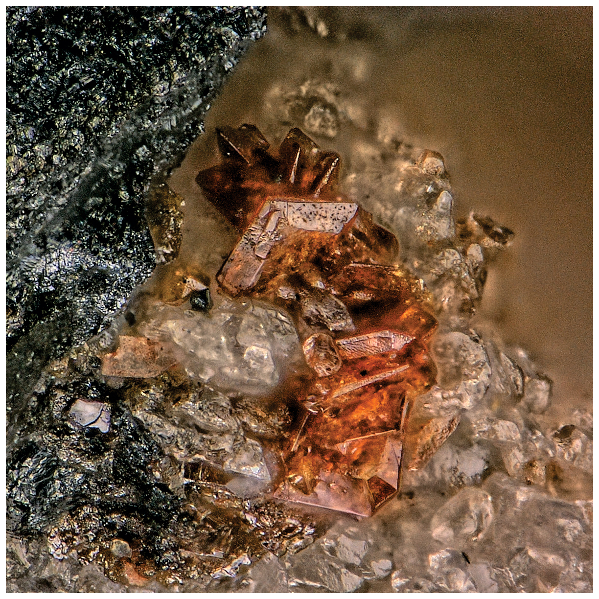 Figure 1Plumbogottlobite crystals on baryte and hausmannite on holotype specimen 77403; the field of view is 0.37 mm across.