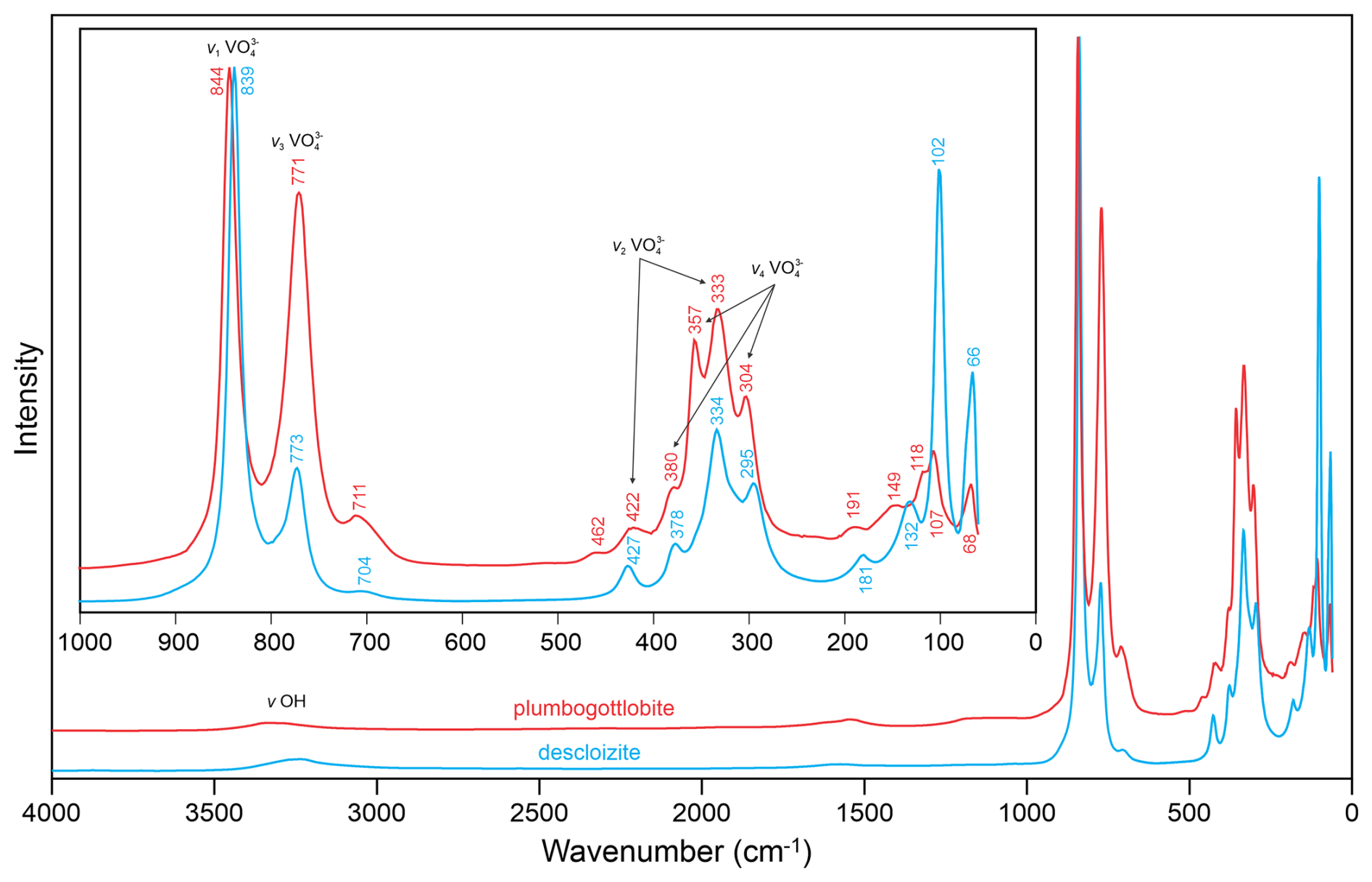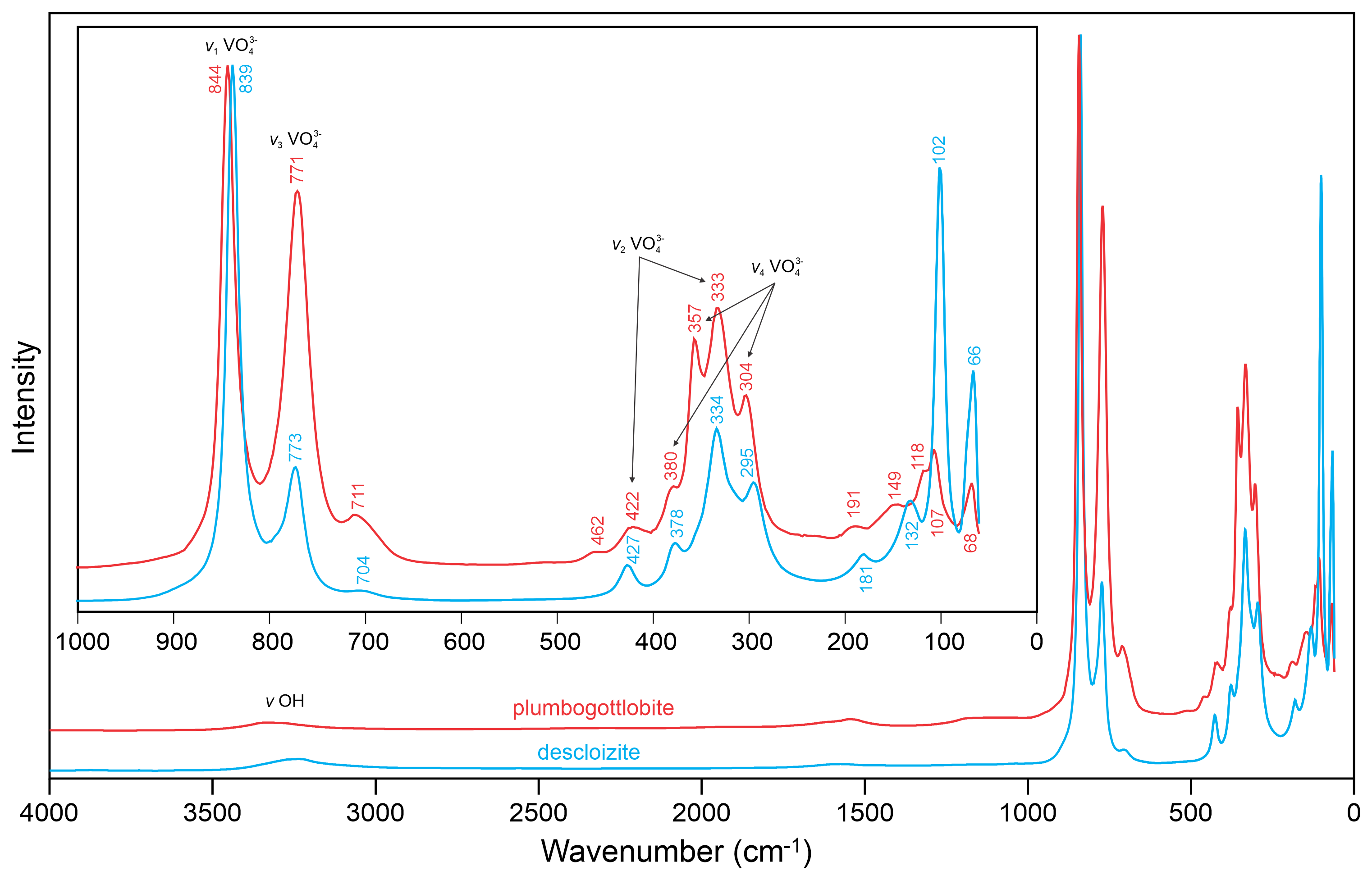 The spectrum of plumbogottlobite is very similar to that of descloizite. A broad, weak band is seen in both spectra in the OH stretching region. The very weak feature at about 1550 cm−1 is probably an overtone. Between 1000 and 200 cm−1, both spectra are dominated by bands related to the stretching and bending vibrations of the VO4 tetrahedron. The mode assignments shown in Fig. 3 are based on Frost et al. (2001), Martens et al. (2003), and Đorđević et al. (2016).