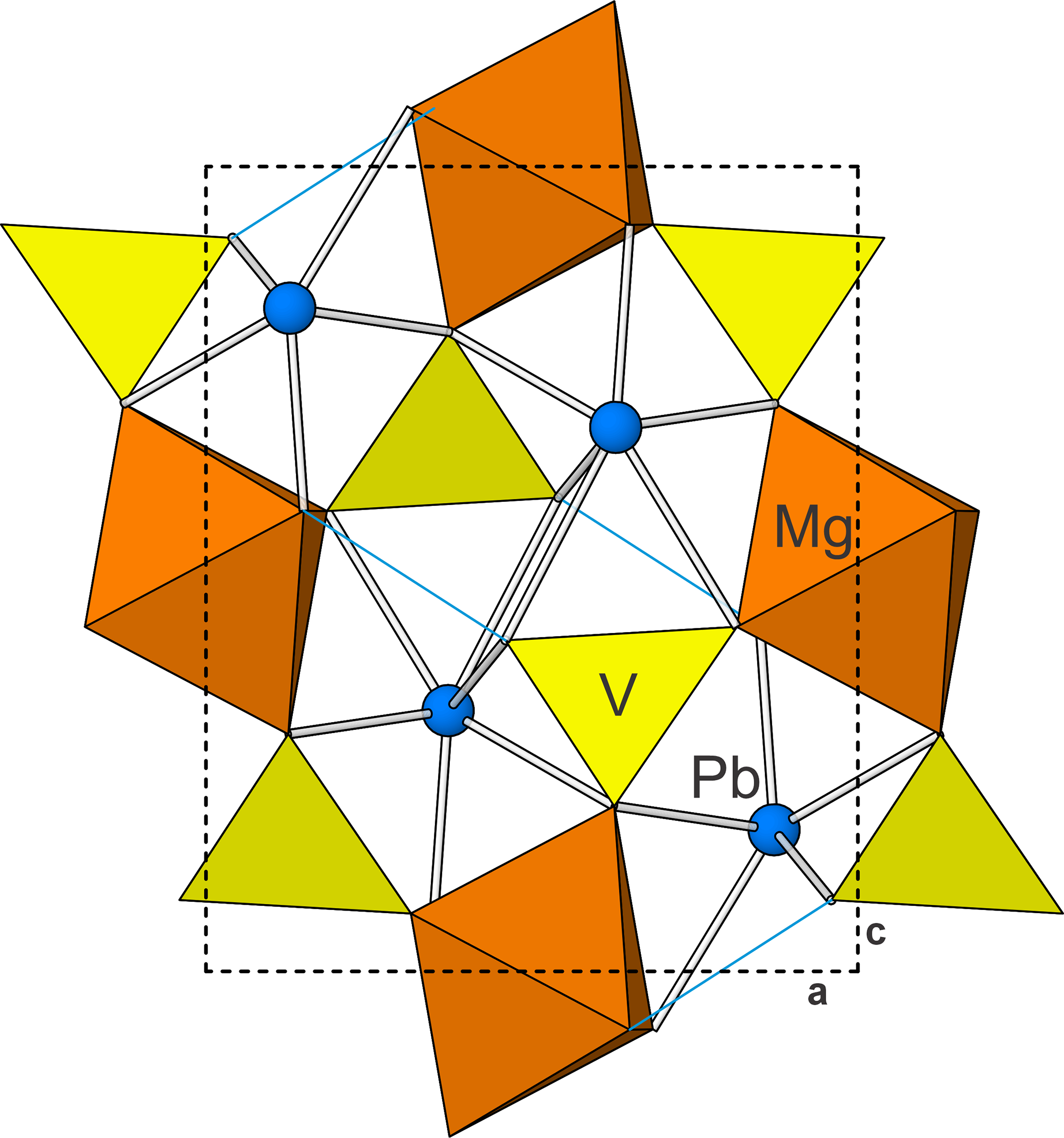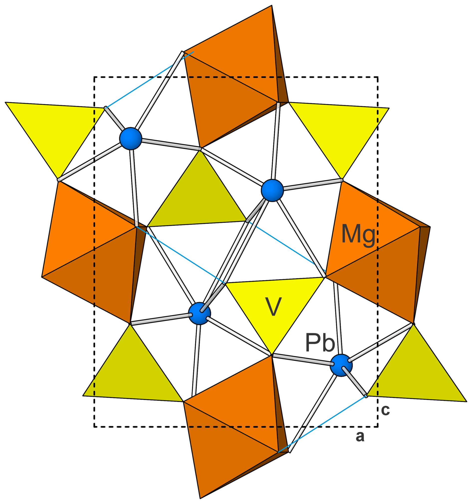 In the structure of plumbogottlobite, edge-sharing chains of MgO4(OH)2 octahedra running parallel to [010] are corner-linked by VO4 tetrahedra to form a three-dimensional framework. Cavities within the framework host Pb2+ cations. The Pb2+ is nine-coordinated, with three short bonds (2.37–2.47 Å) on one side and six longer bonds (2.73–3.23 Å) on the other, clearly showing the 6s2 lone-pair electrons of Pb2+ to be stereoactive. The structure is shown in Fig. 4.