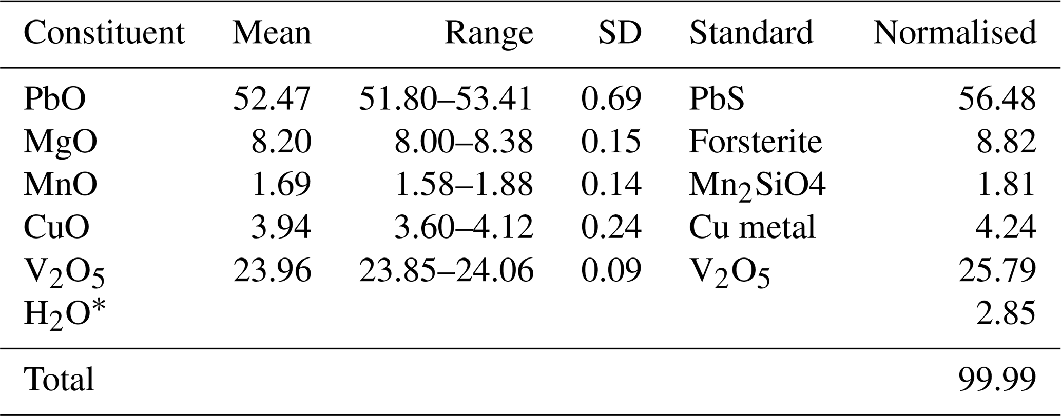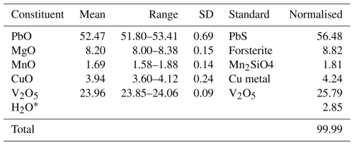 Crystals of plumbogottlobite were analysed at Caltech on a JEOL JXA-iHP200F field emission electron probe microanalyser (EPMA) in wavelength dispersive spectroscopy (WDS) mode (four points). The analytical conditions were 15 kV accelerating voltage, 10 nA beam current, and 5 µm beam diameter. Insufficient material is available for the determination of H2O, and so it was calculated based on the structure (V = 1 and O = 5). No other elements were detected in energy-dispersive spectroscopy (EDS) analyses. The crystals did not take a good polish, which provided analyses that are estimated to be low by about 7.5 %. Consequently, the analyses have been normalised. Analytical data are given in Table 1.