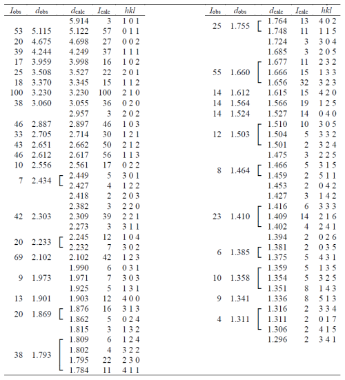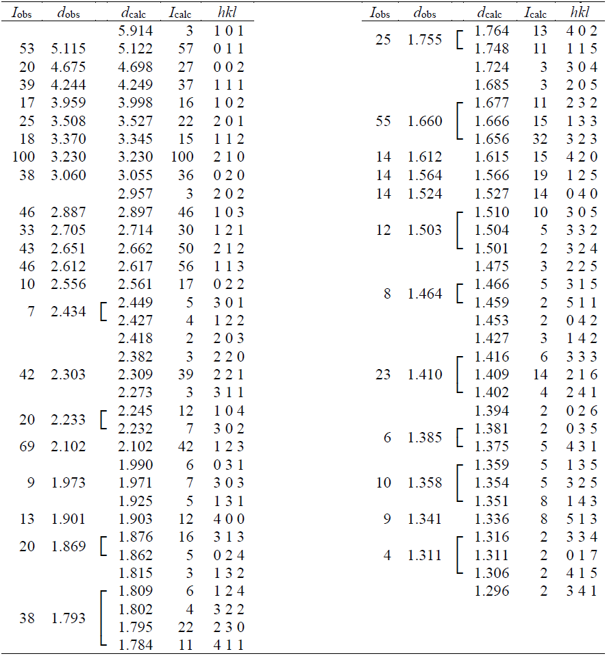 X-ray powder diffraction data were recorded using a Rigaku R-Axis Rapid II curved imaging plate microdiffractometer with monochromatised MoKα radiation. A Gandolfi-like motion on the ϕ and ω axes was used to randomise the sample. Observed d values and intensities were derived by profile fitting using JADE Pro software (Materials Data, Inc.). The calculated intensities were calculated from the structure, also using JADE Pro software. Data are given in Table 2. The unit-cell parameters refined from the powder data using JADE Pro with whole-pattern fitting (space group Pnma) are a=7.599(12), b=6.118(10), c=9.394(15) Å, and V=436.7(10) Å3.