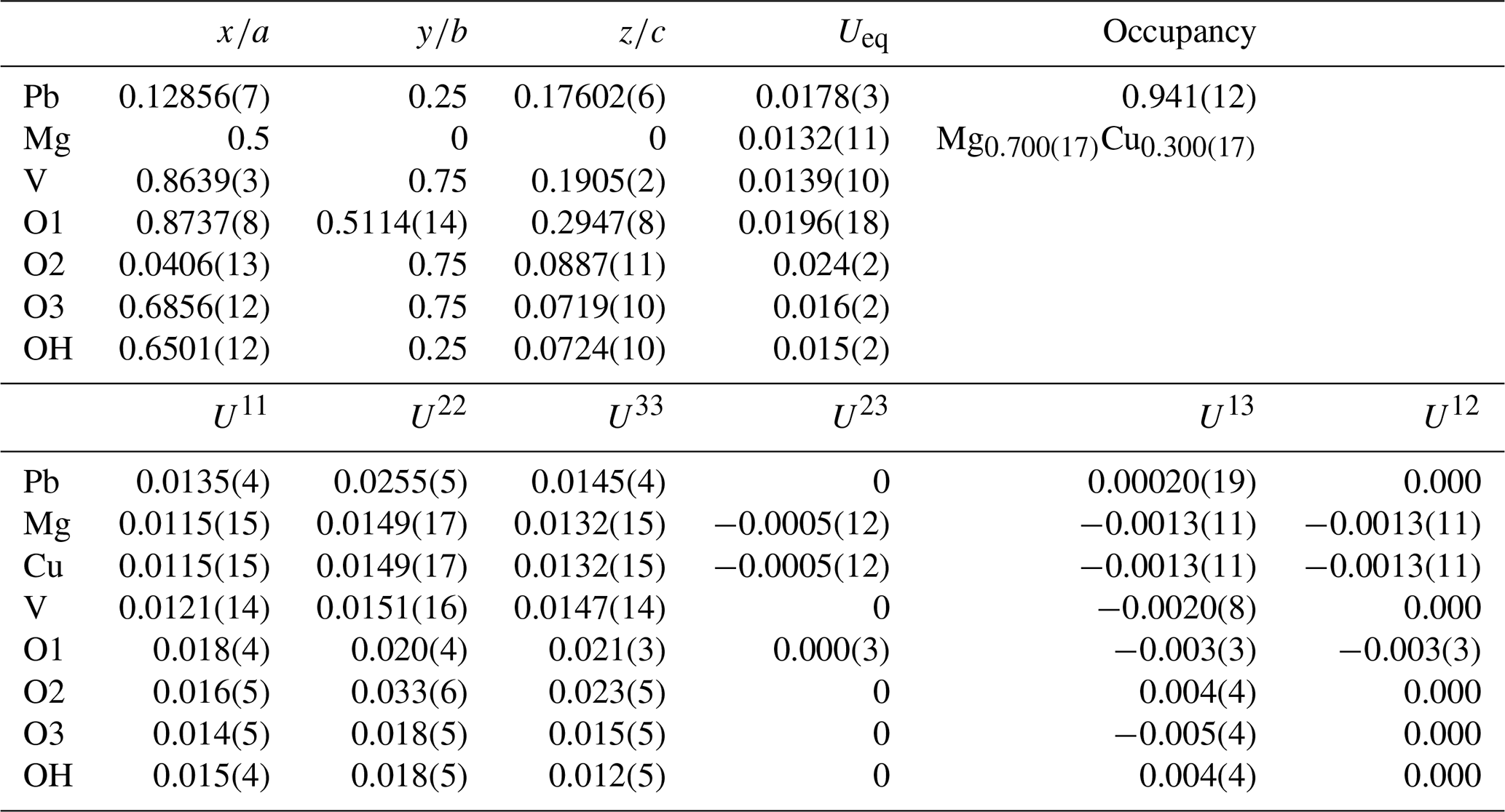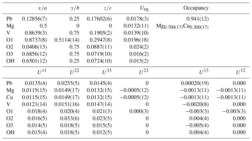 Table 4Refined atom coordinates, displacement parameters (Å2), and site occupancies for plumbogottlobite.